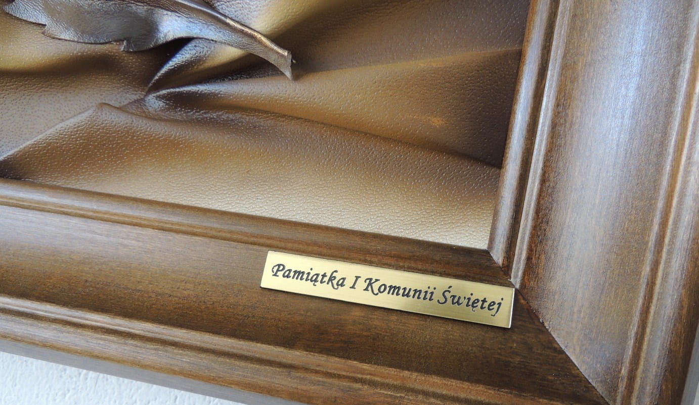 Na tle obrazu w jednym z narożników zamieszczamy złotą tabliczkę z grawerem