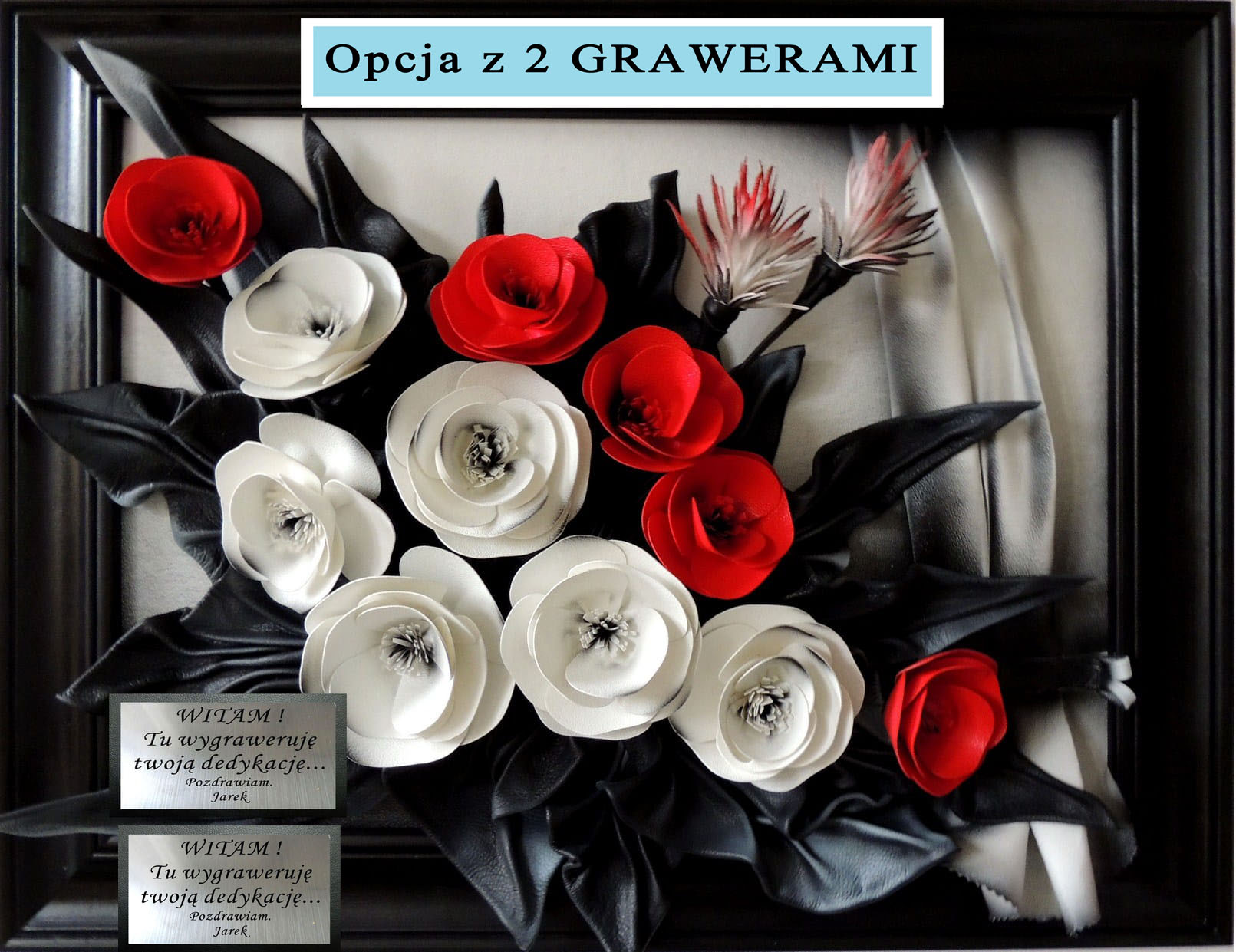 Biało-czerwone kwiaty w czarnej ramie - obraz na prezent JUBILEUSZOWY