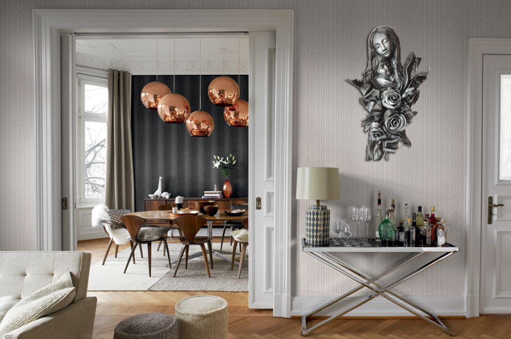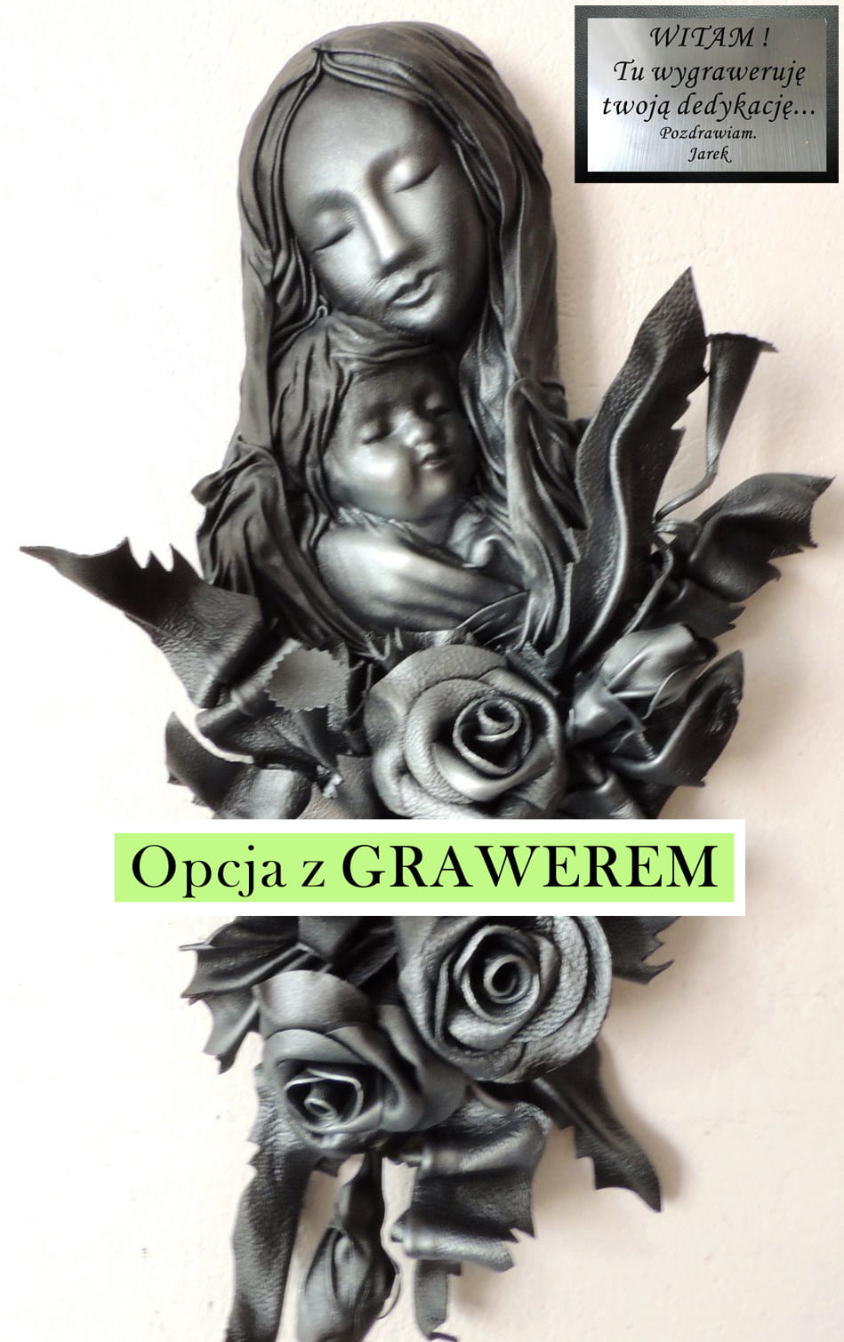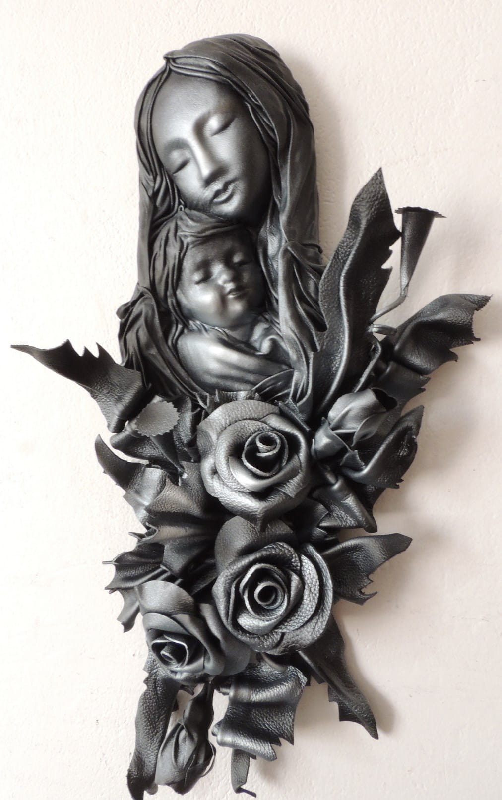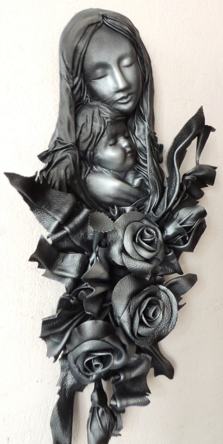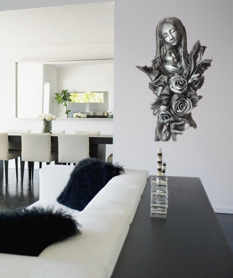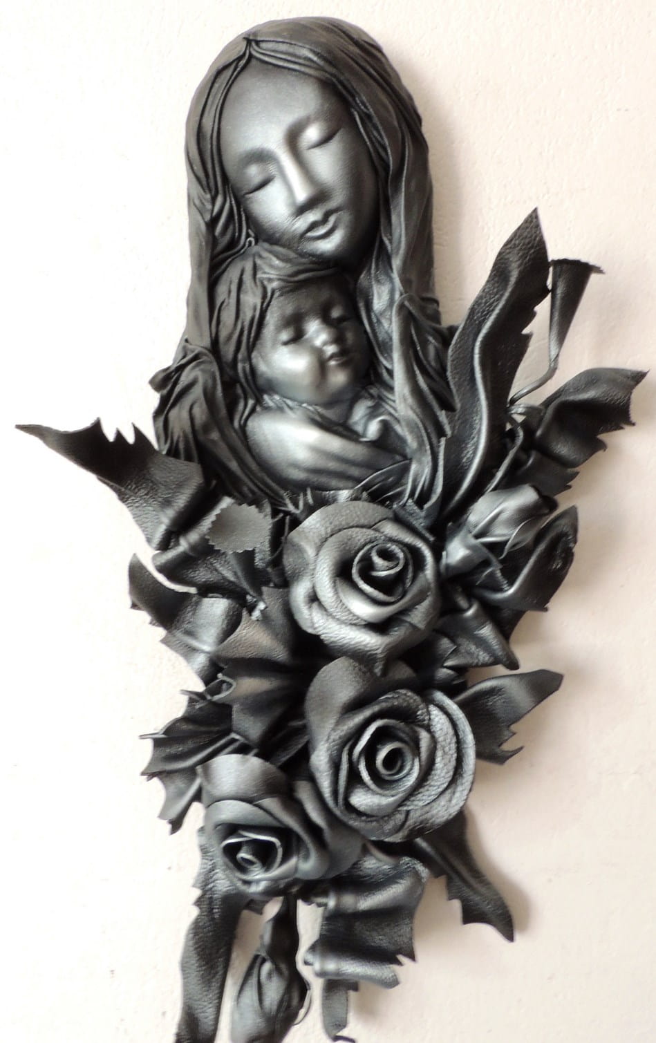 Czarno srebrna płaskorzeźba Maryji z różami na prezent ślubny - MBK-5