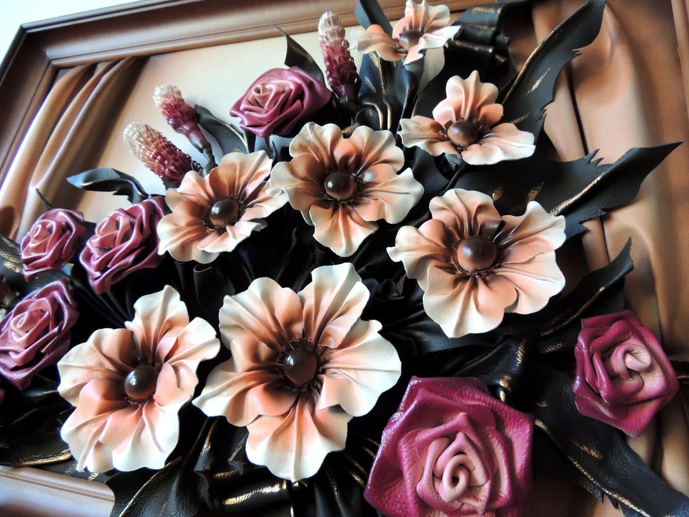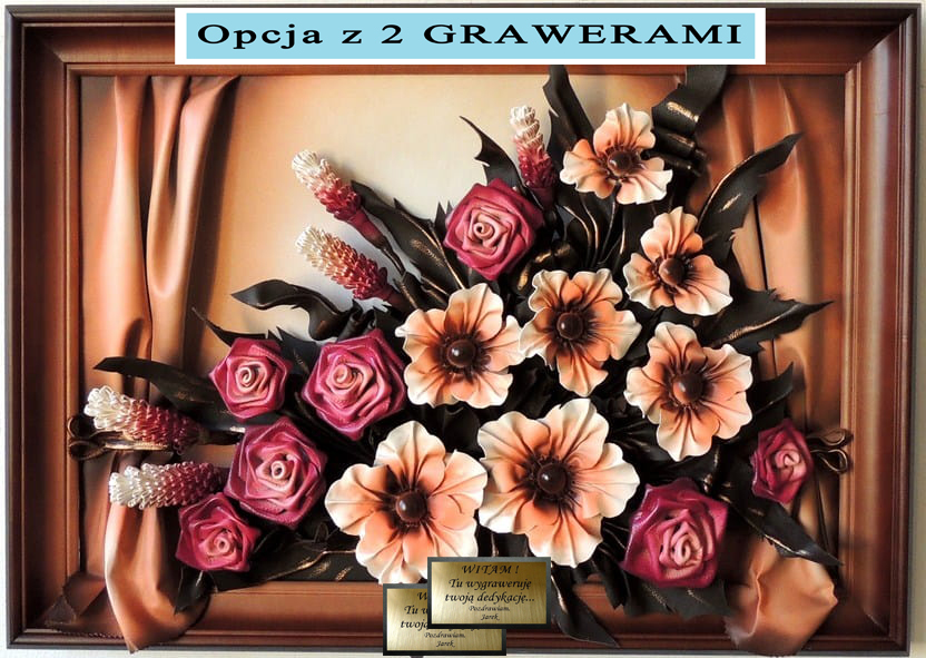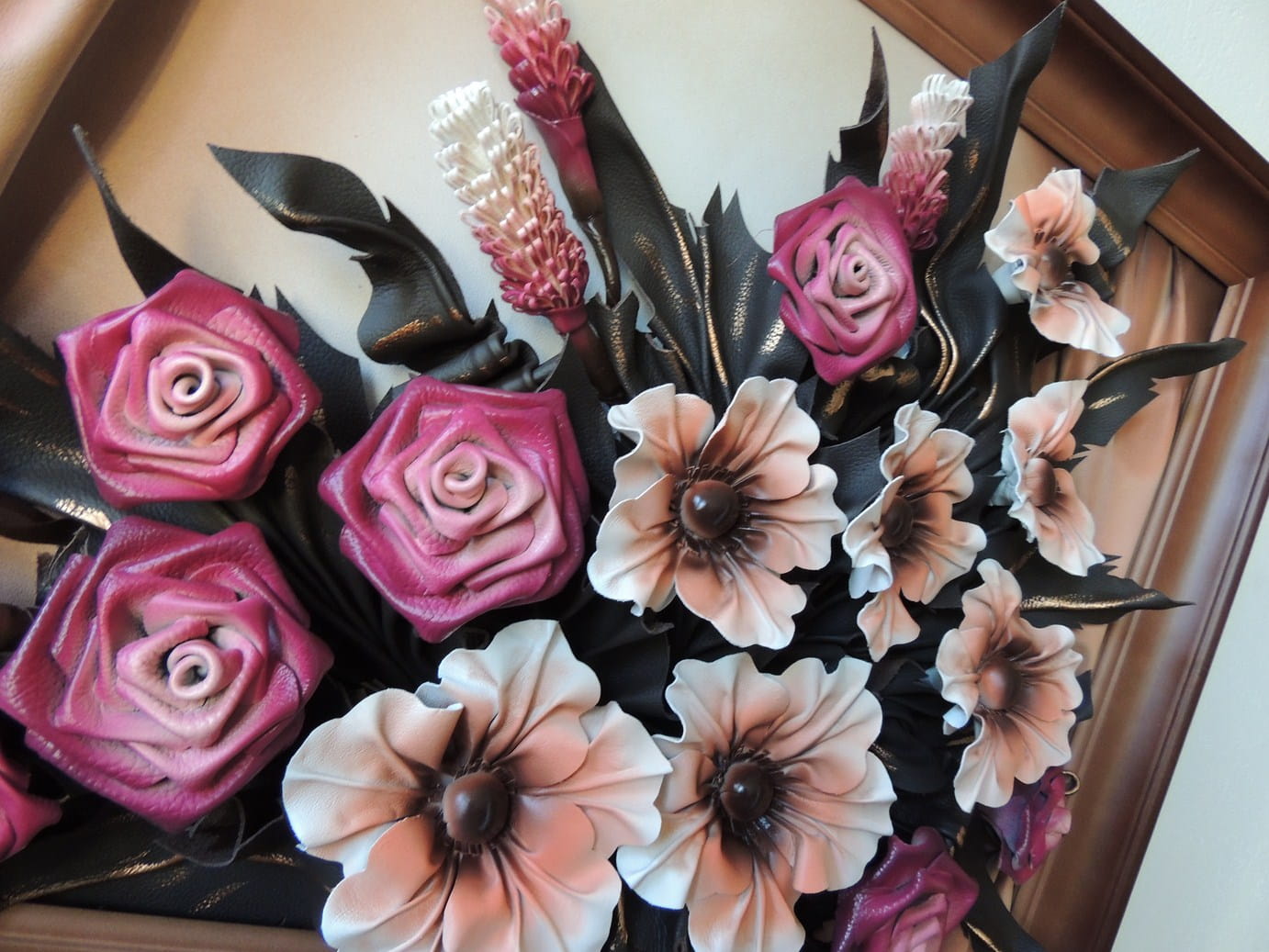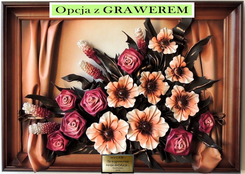 DUŻY OBRAZ ZE SKÓRY " KOMPOZYCJA KWIATOWA" na podziękowanie ROCZNICĘ urodziny