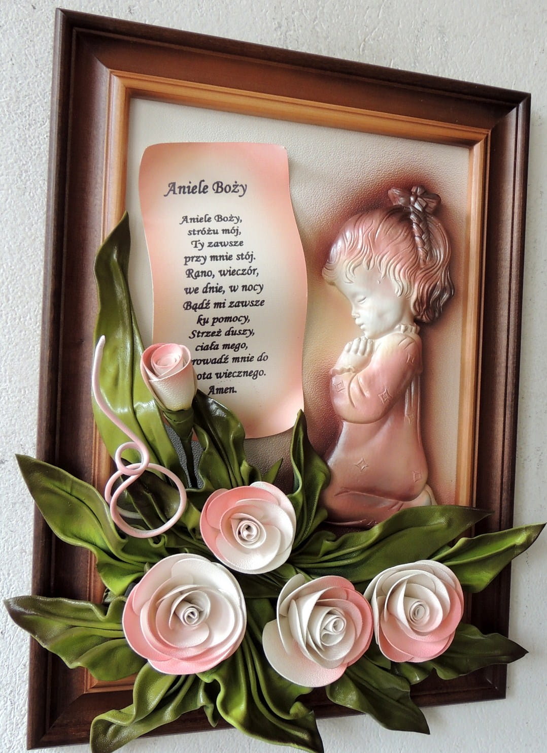 DZIEWCZYNKA MODLĄCA SIĘ DO ANIOŁA STRÓŻA Z MODLITWĄ. RĘKODZIEŁO, PROSTA FORMA, RAMA DREWNIANA. A3-D2
