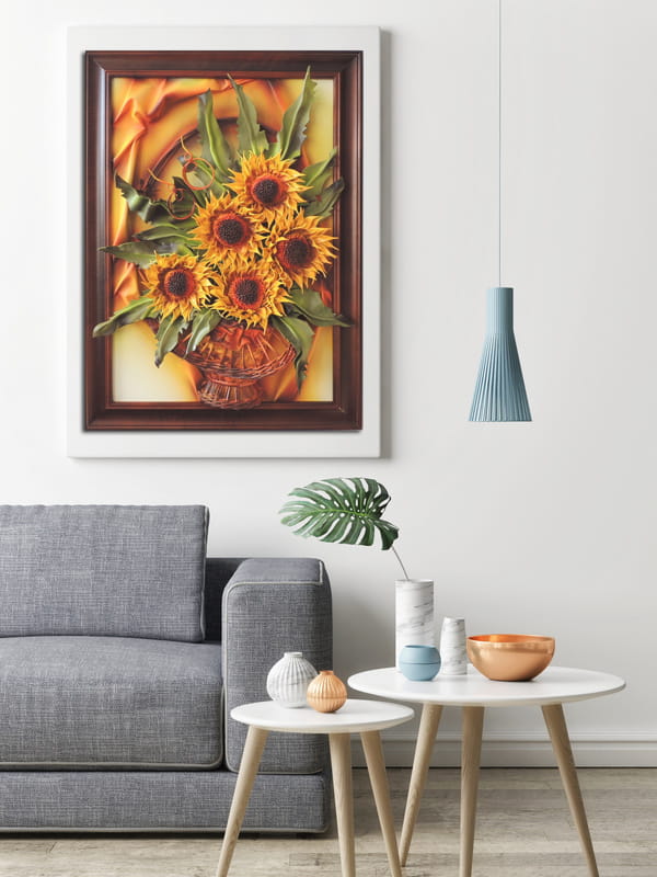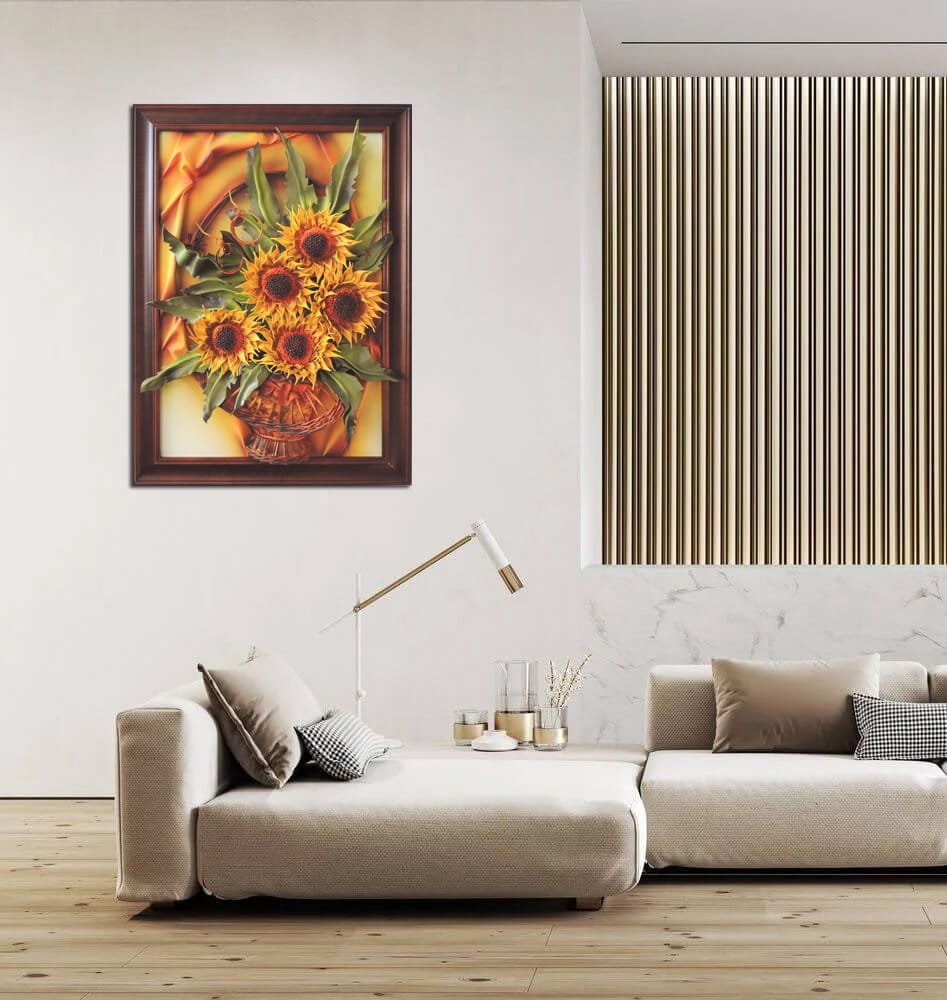 Duży obraz z bukietem słoneczników w wiklinowym koszu i drewnianej ramie NA PREZENT