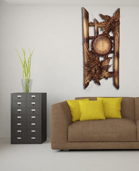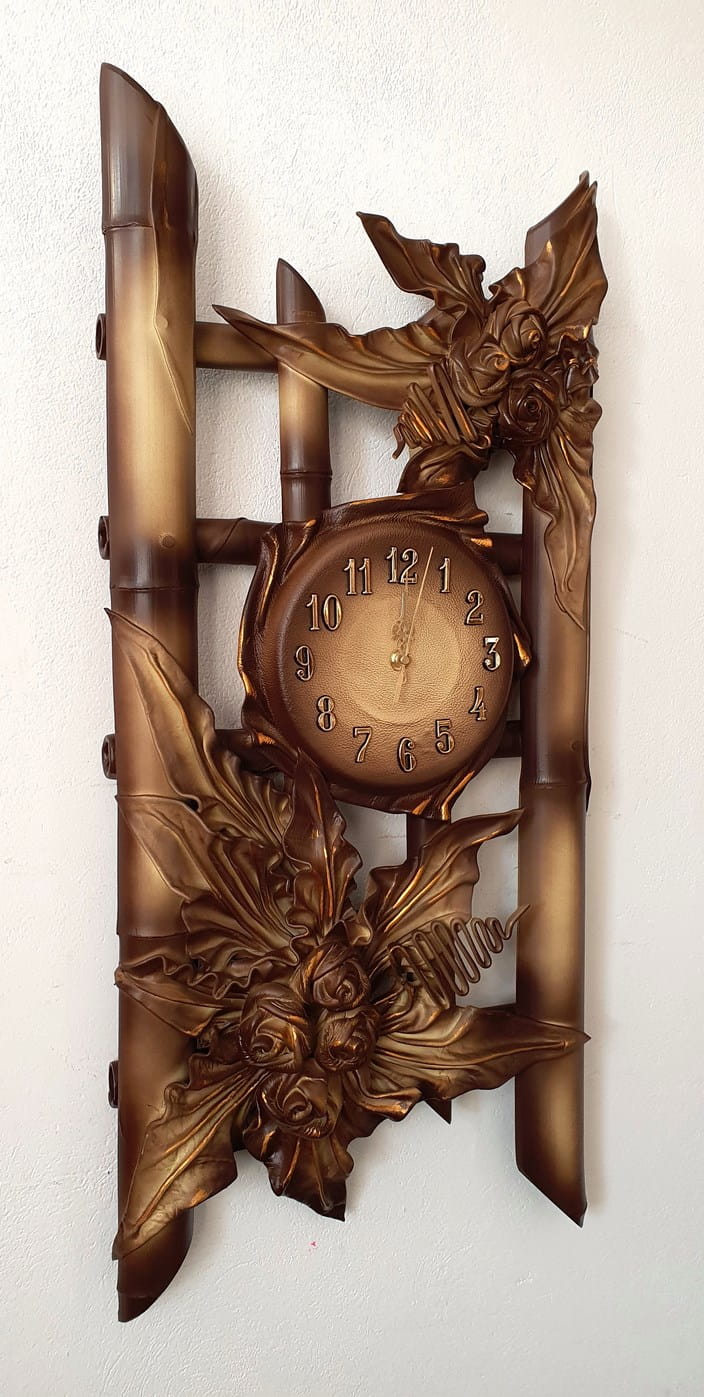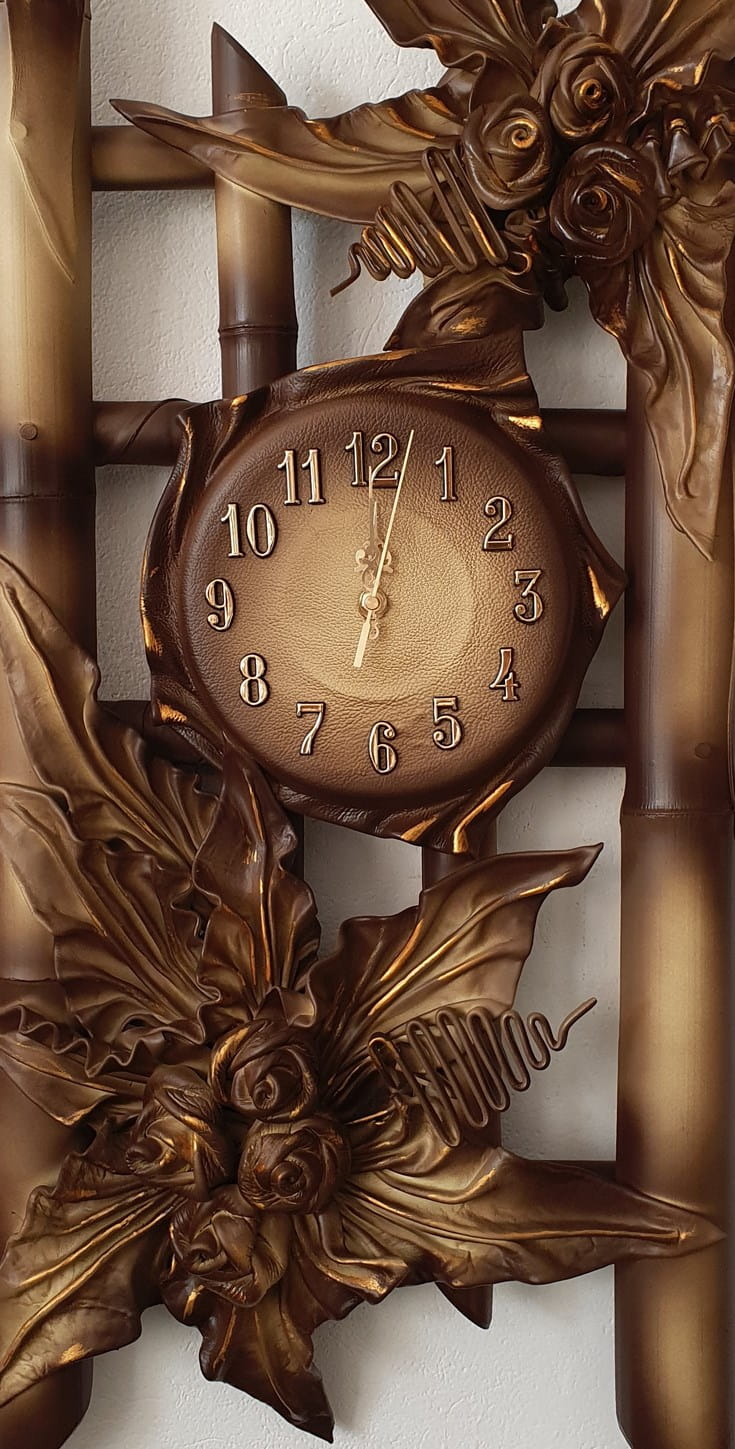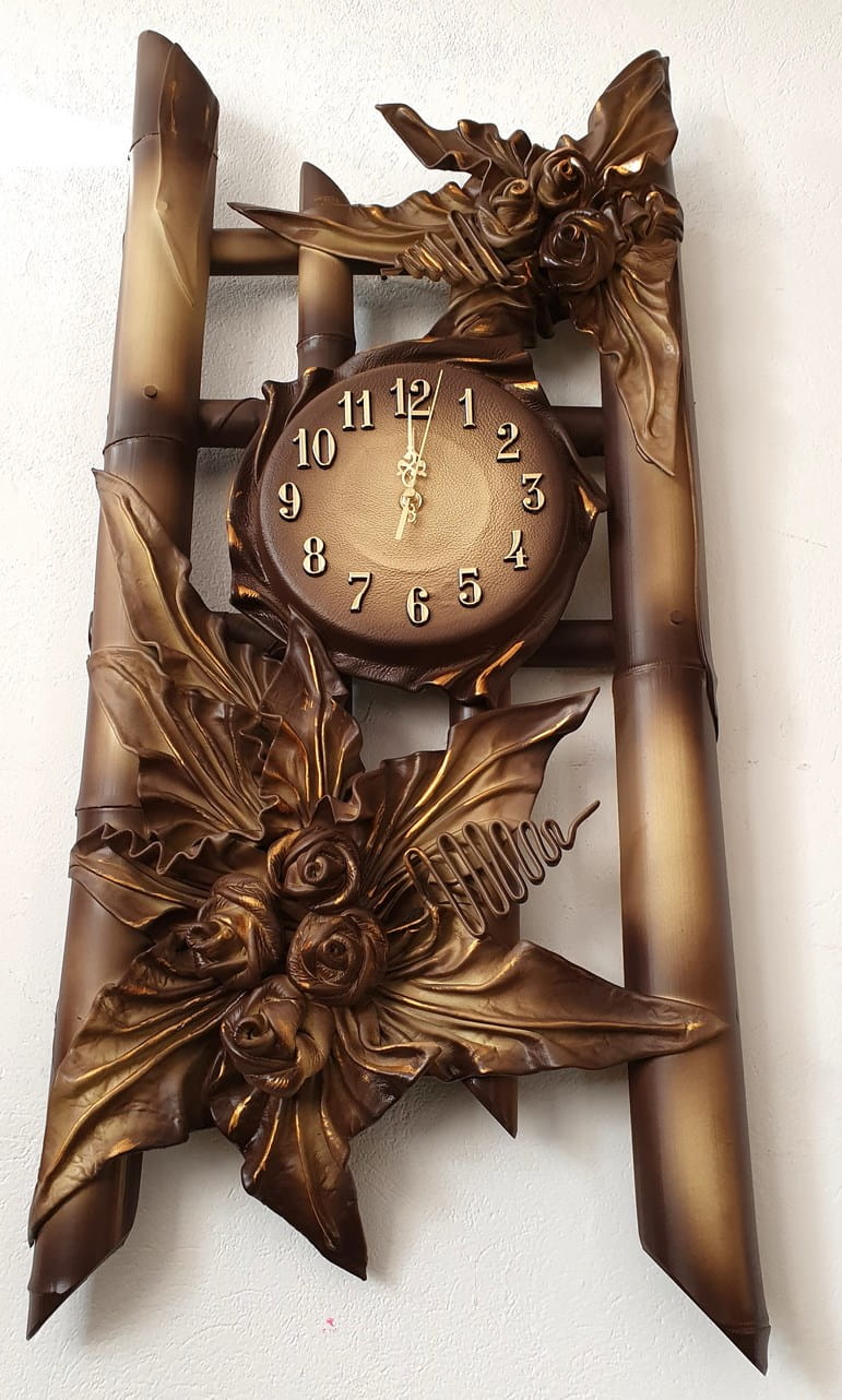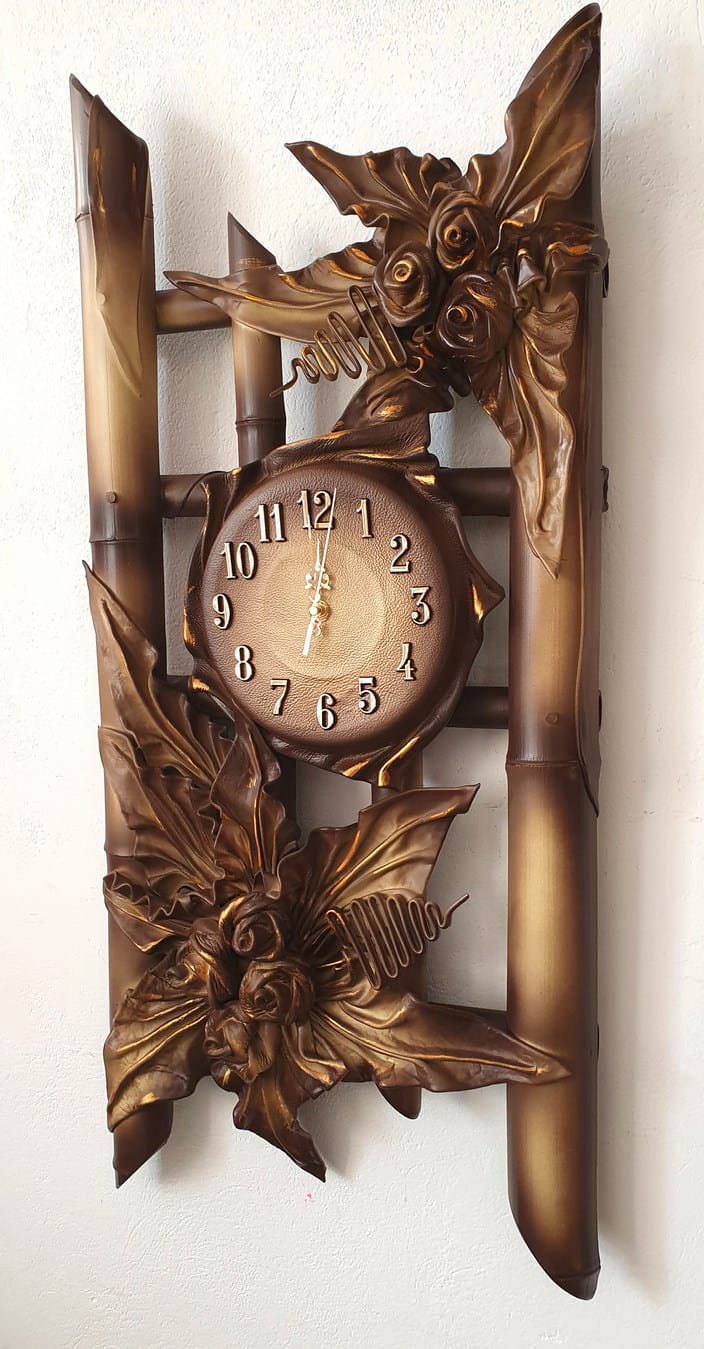 Duży zegar ze skóry na stelażu z bambusa