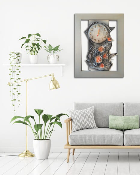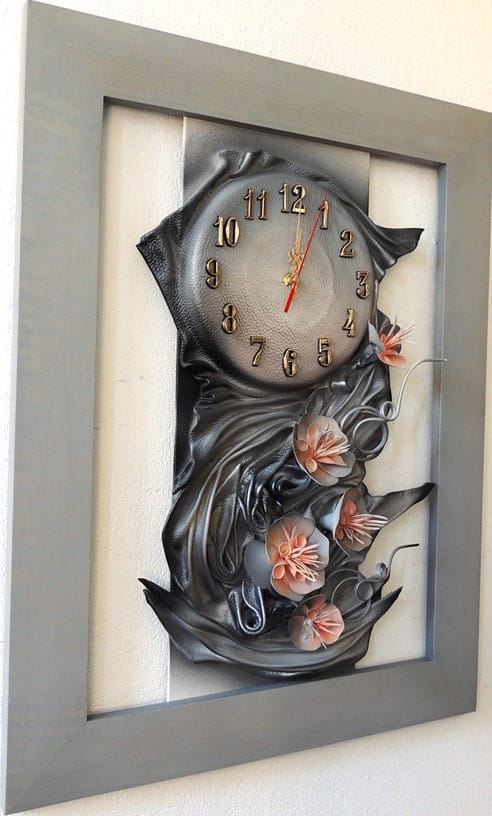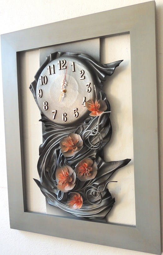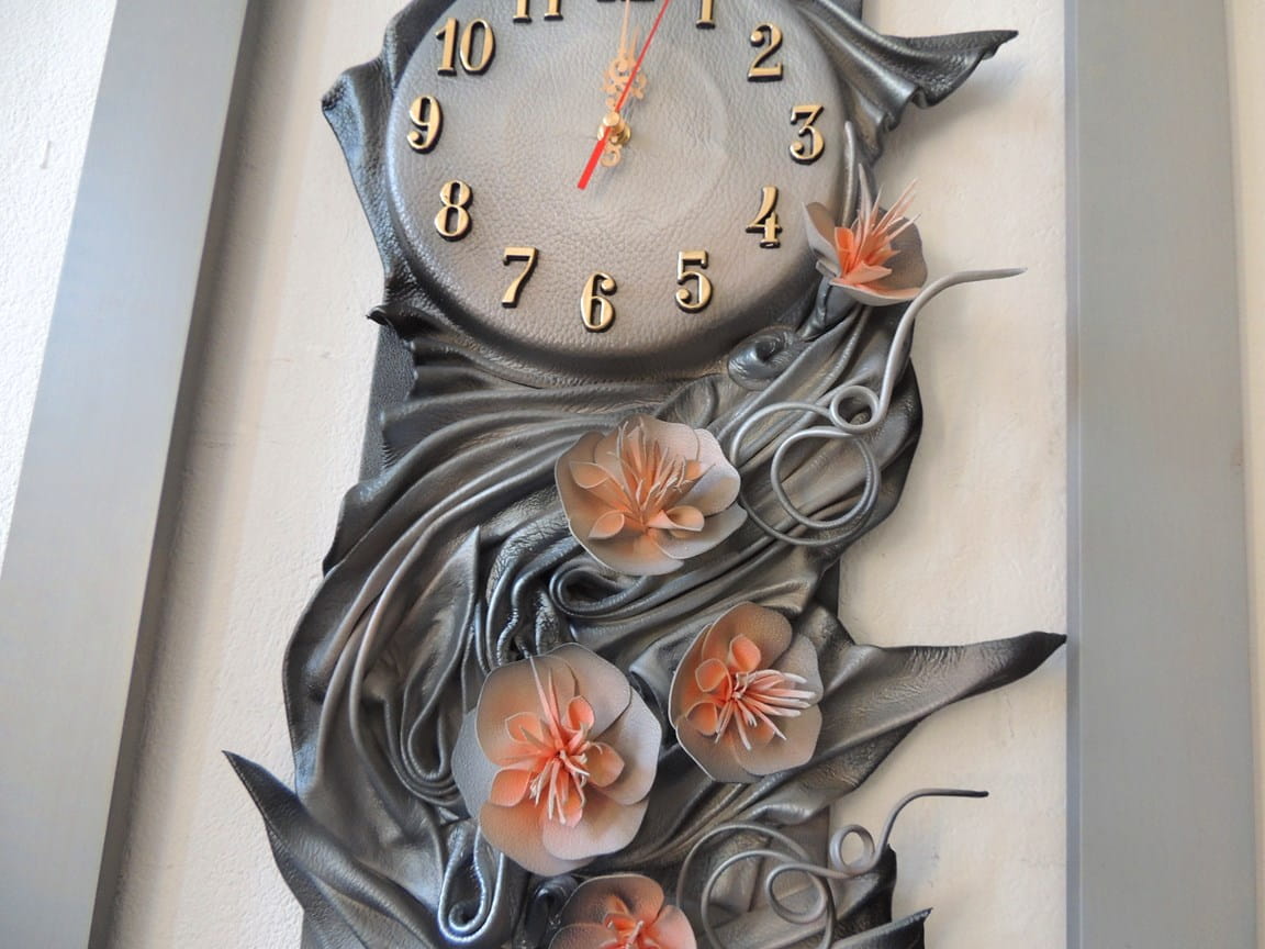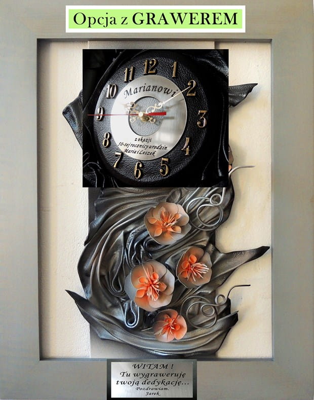 Duży zegar ścienny w skórze i drewnianej ramie + kwiaty - RZ6-2