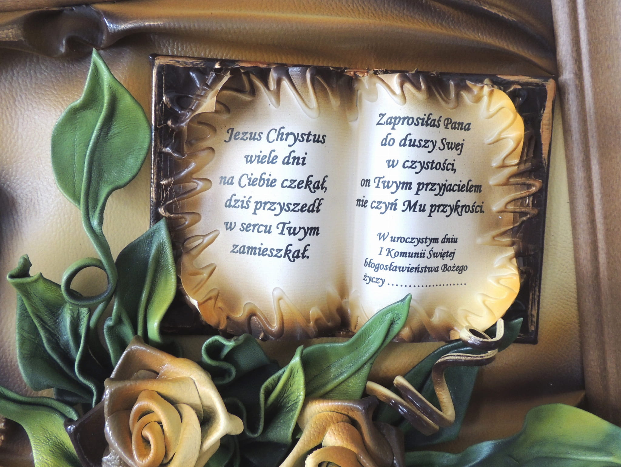 Na tle obrazu w jednym z narożników zamieszczamy złotą tabliczkę z grawerem