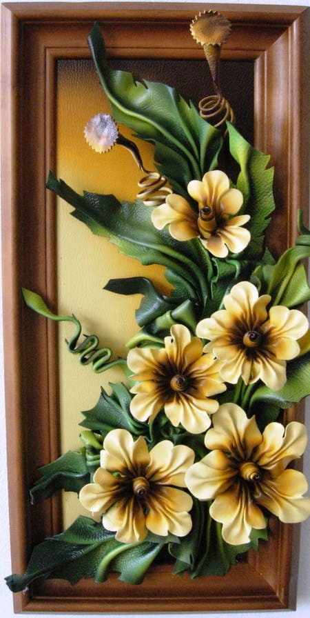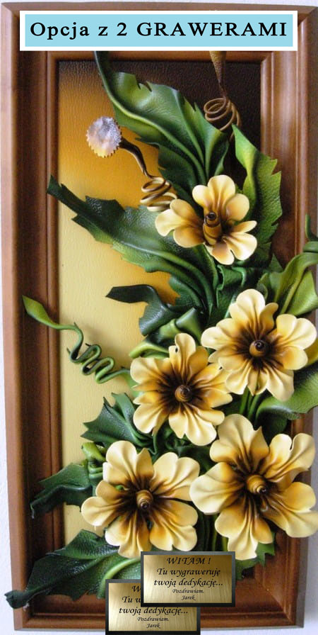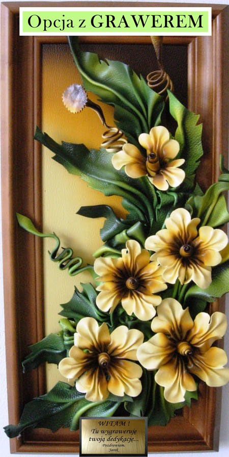 Kwiaty ze skóry w obrazie - wąska drewniana rama - prezent na jubileusz