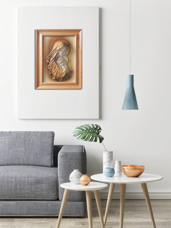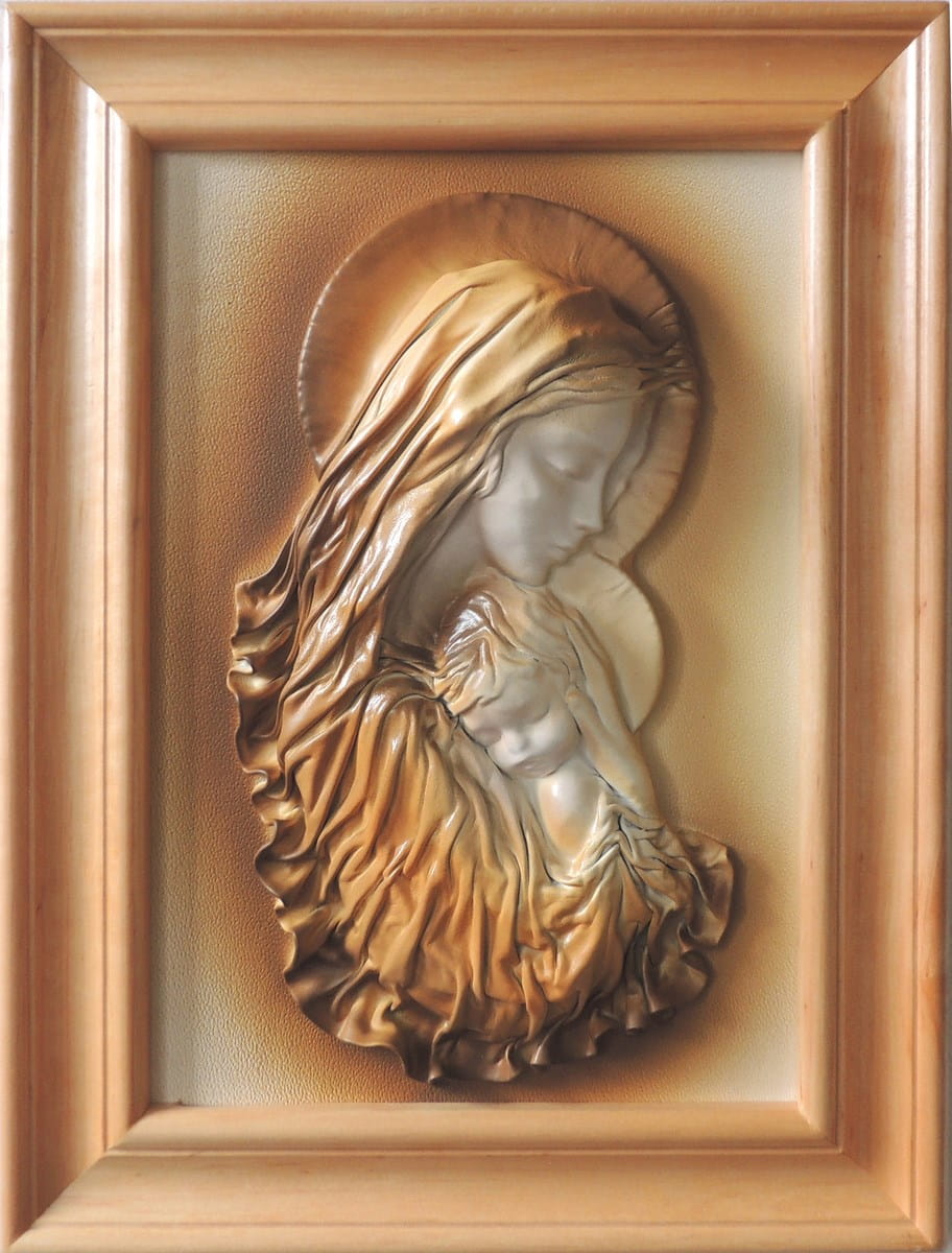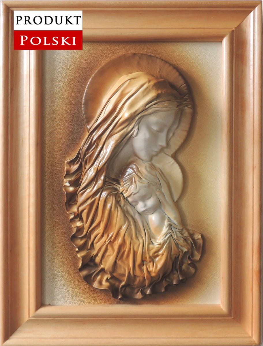 Matka Boska obraz w ramie z litego drewna - Rękodzieło skóra - S2-14