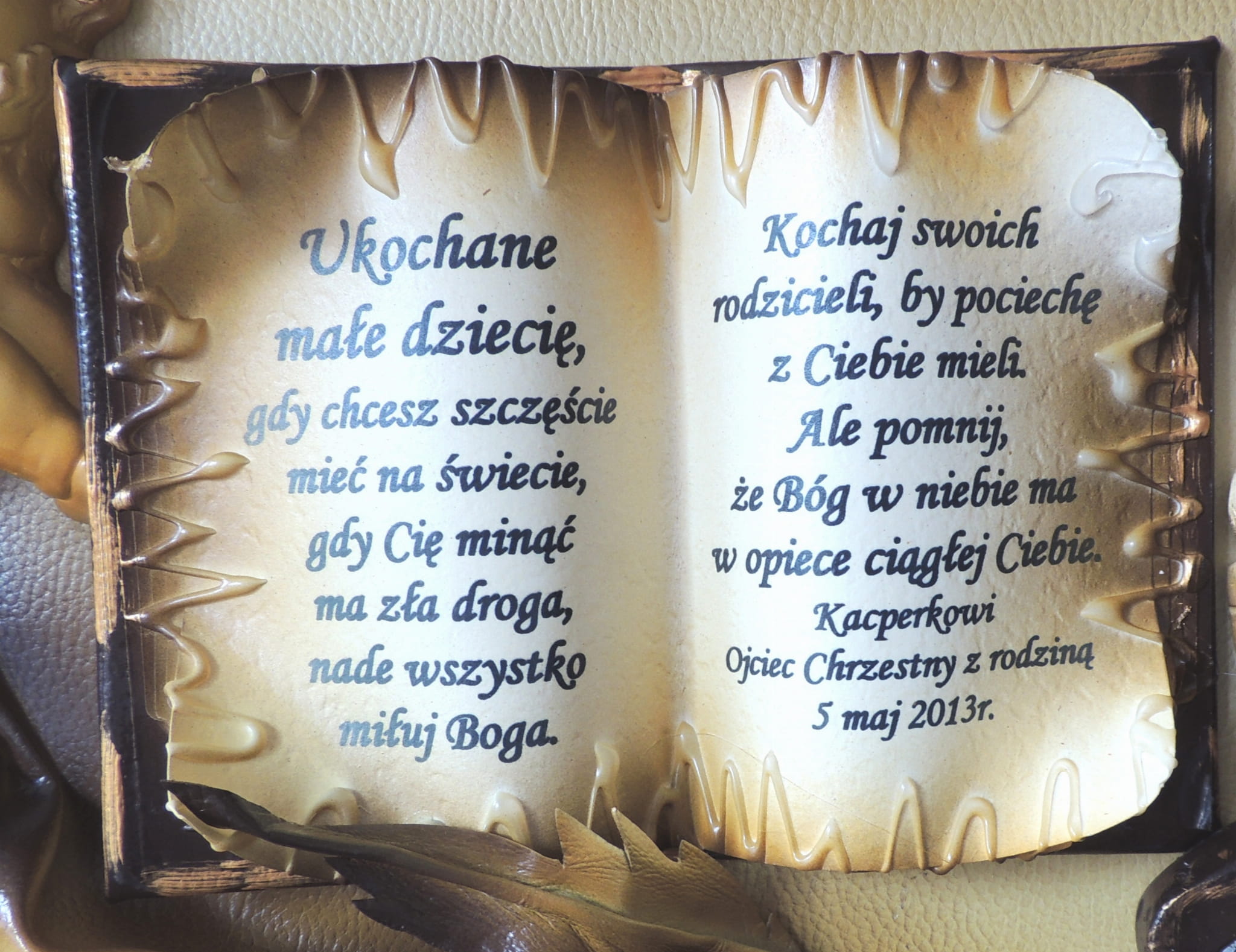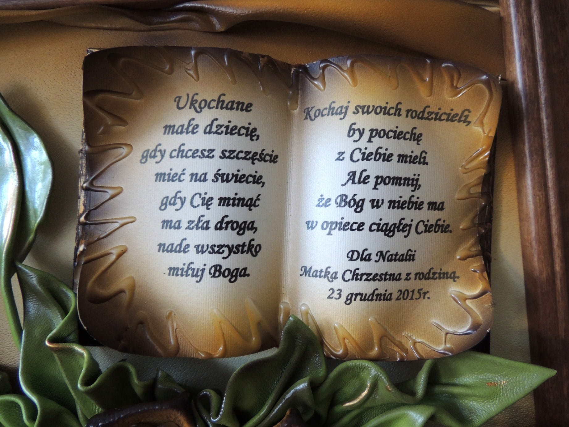 Na tle obrazu w jednym z narożników zamieszczamy złotą tabliczkę z grawerem