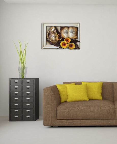 Na ramie obrazu w jednym z narożników zamieszczamy złotą tabliczkę z grawerem, na życzenie tabliczkę możemy zamieścić też na odwrocie obrazu