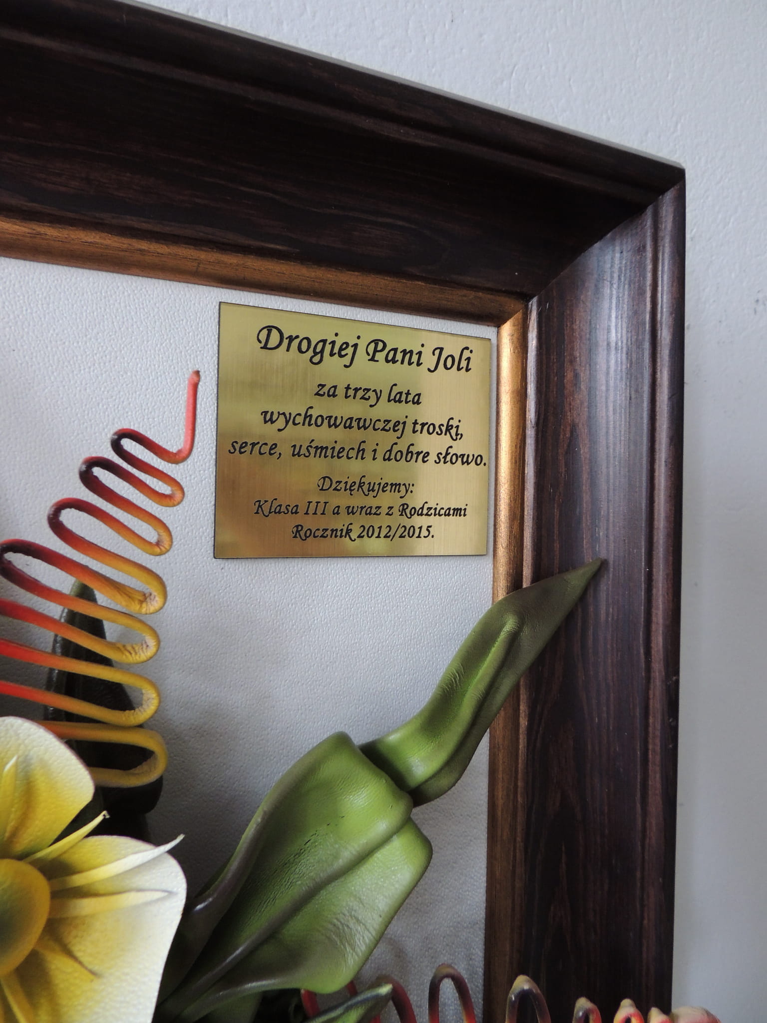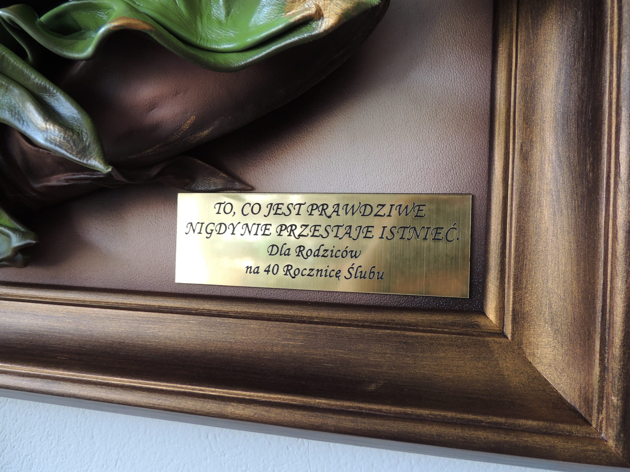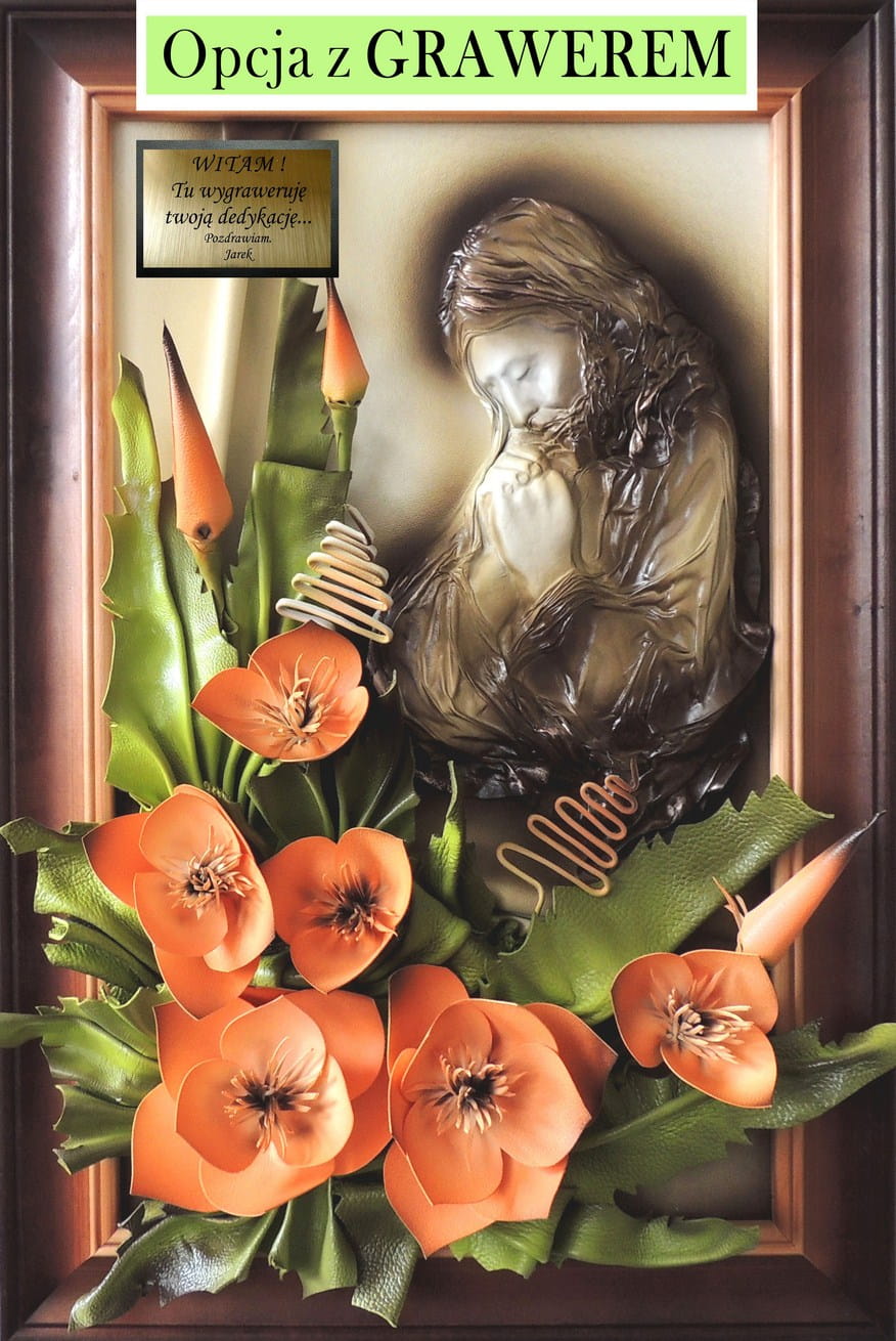 Na tle obrazu w jednym z narożników zamieszczamy złotą tabliczkę z grawerem