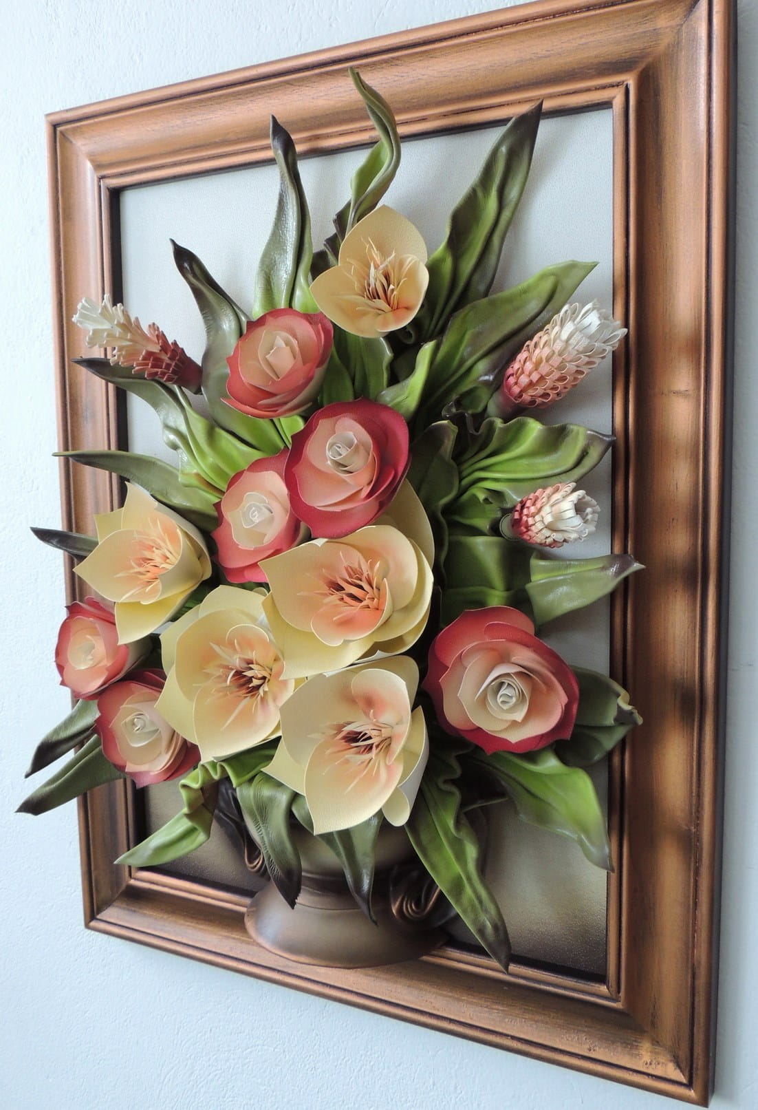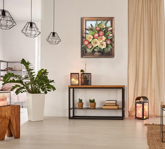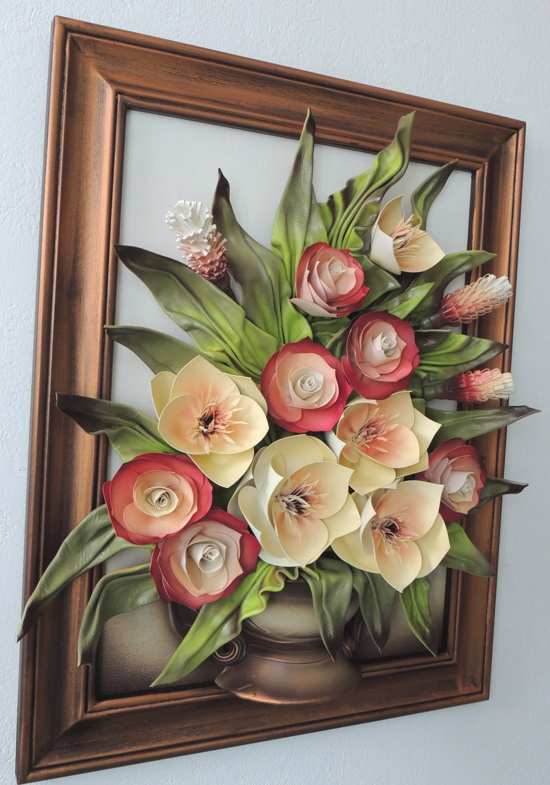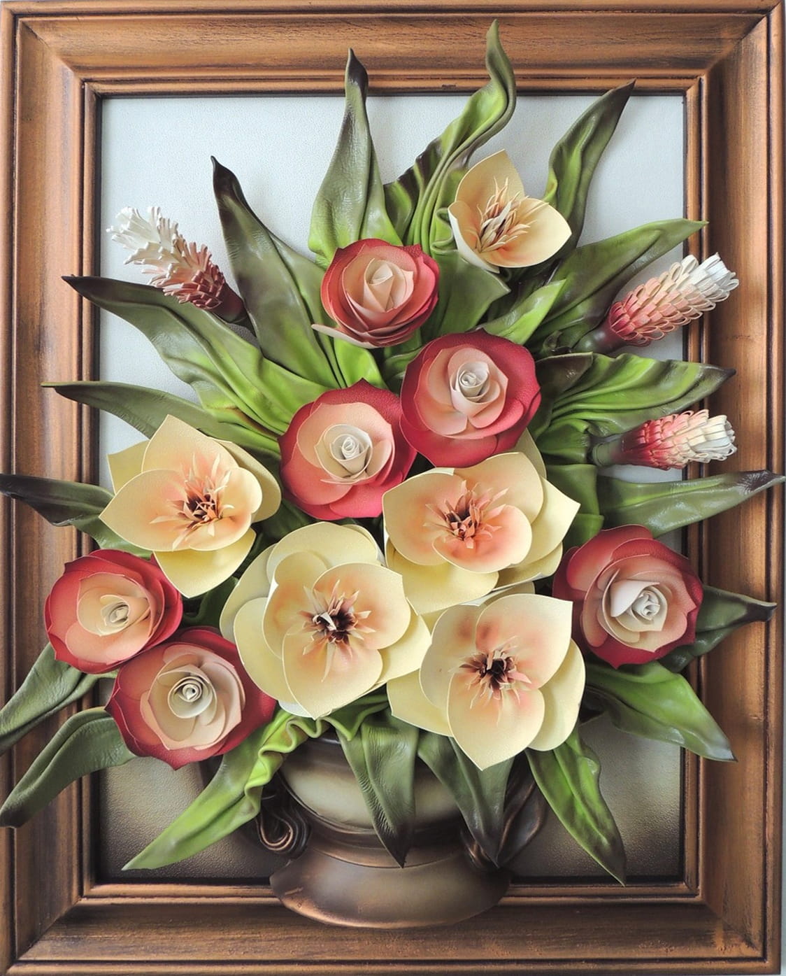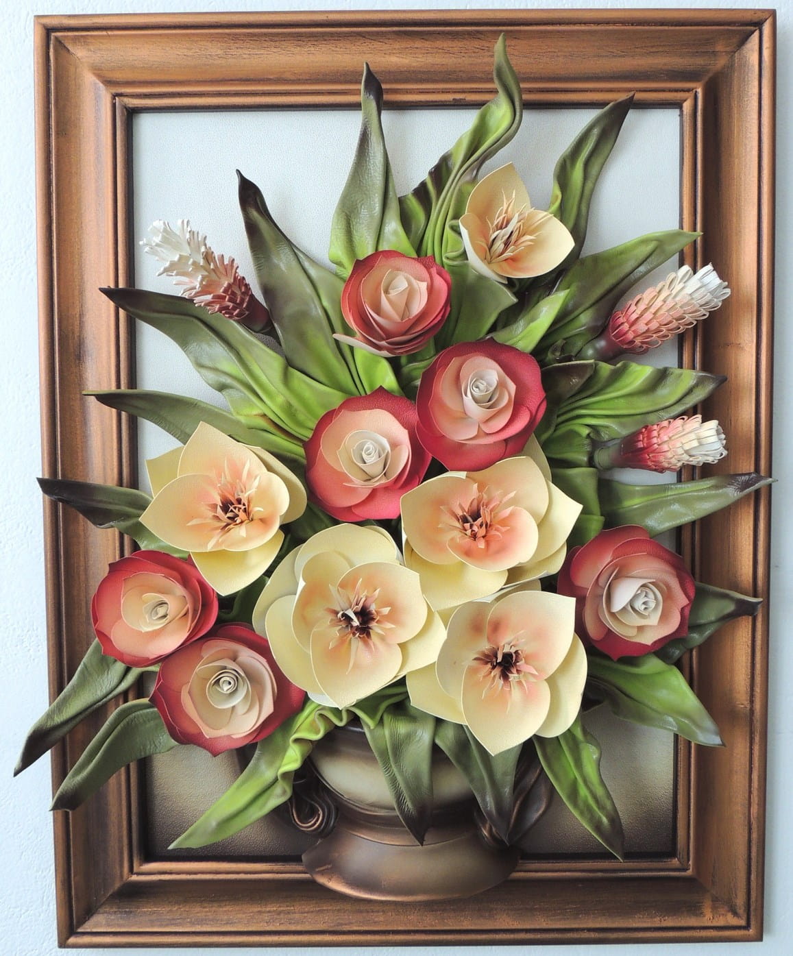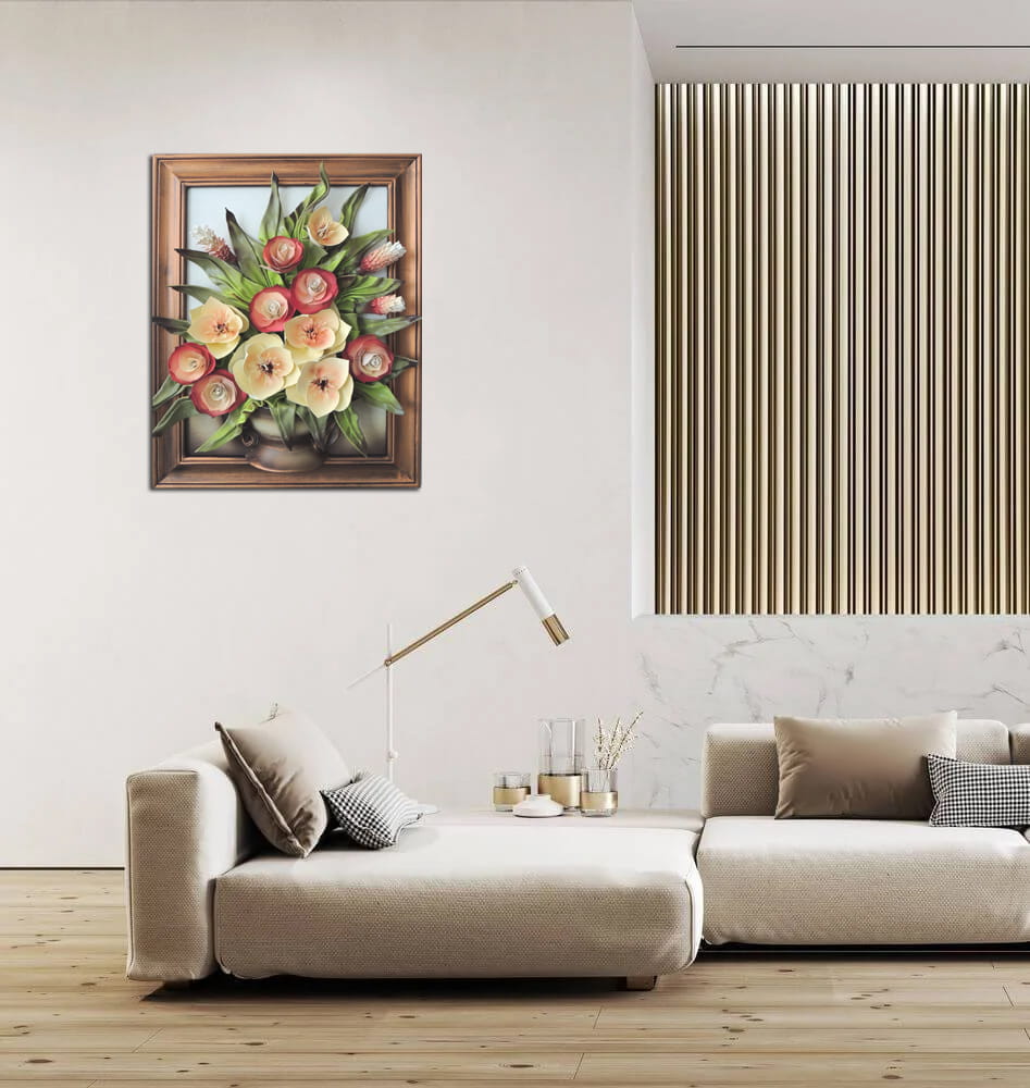 Obraz 3D z bukietem kwiatów w wazonie i złotej drewnianej ramie
