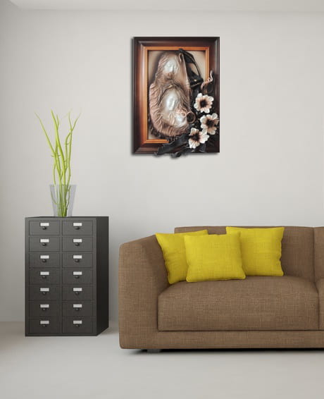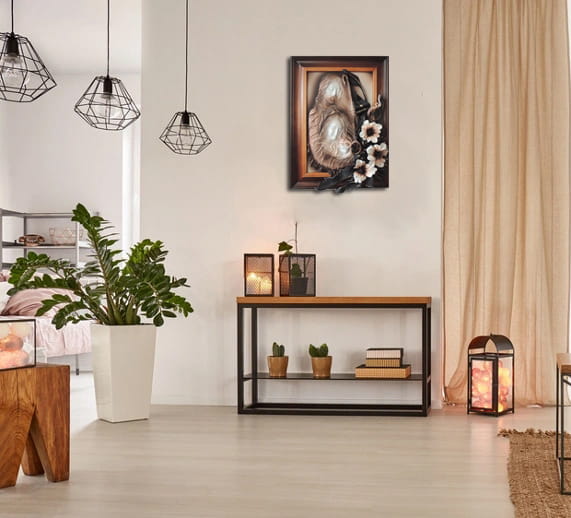 Na tle obrazu w jednym z narożników zamieszczamy złotą tabliczkę z grawerem,