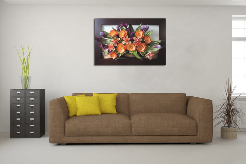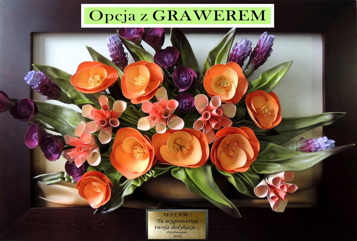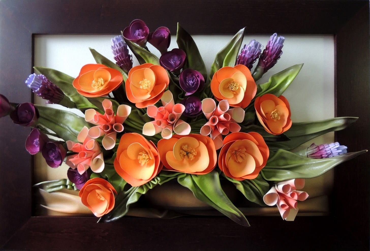 Obraz kwiatowy - bukiet kolorowych kwiatów w wazonie - RĘKODZIEŁO ze skóry