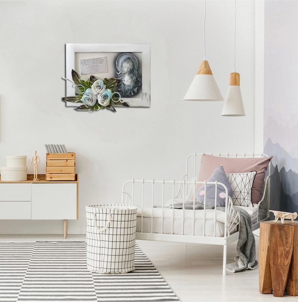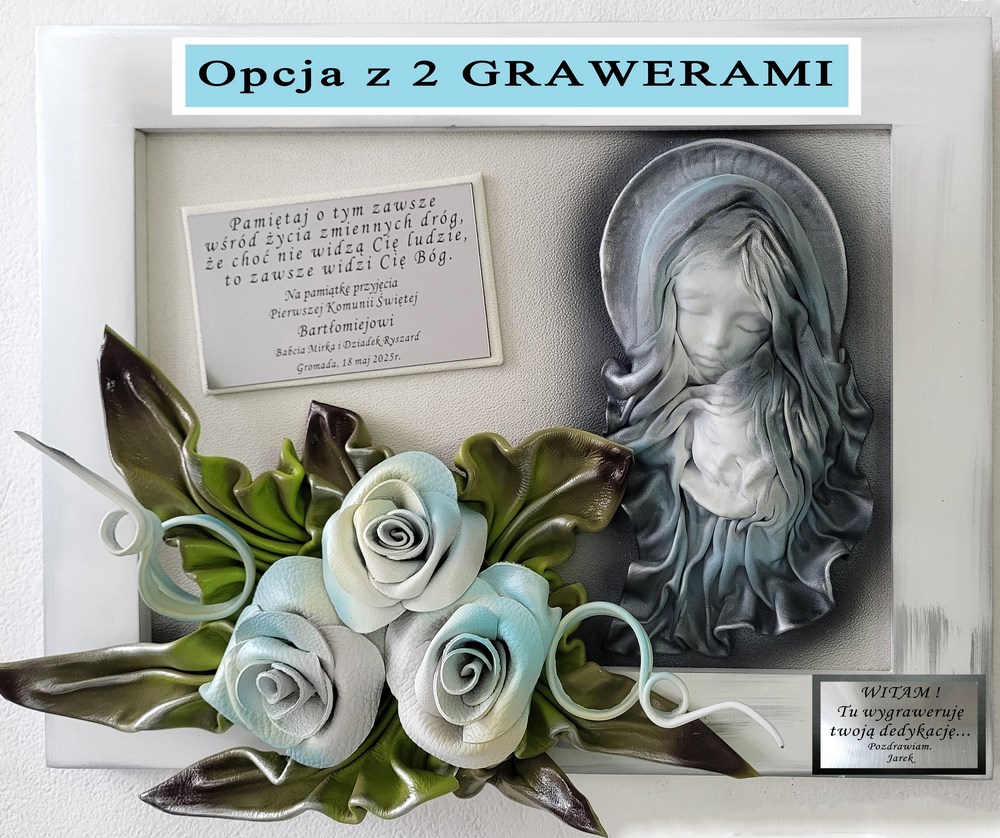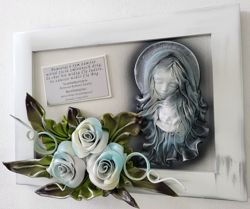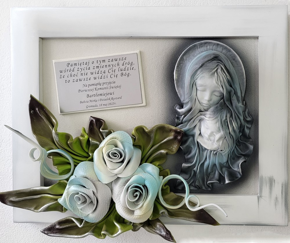 Obraz z Maryją i niebieskimi różami - na prezent z okazji Chrztu - Komunii Świętej