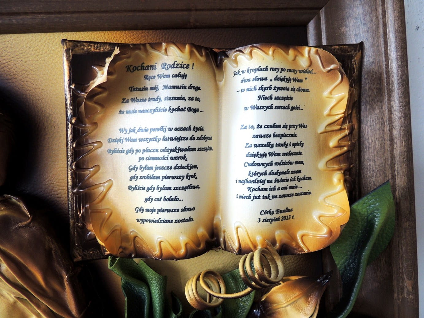 Na tle obrazu w jednym z narożników zamieszczamy złotą tabliczkę z grawerem,