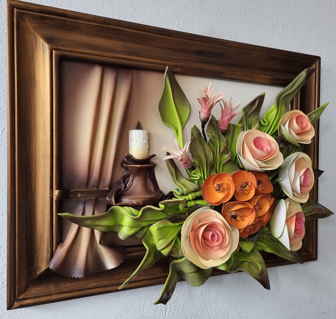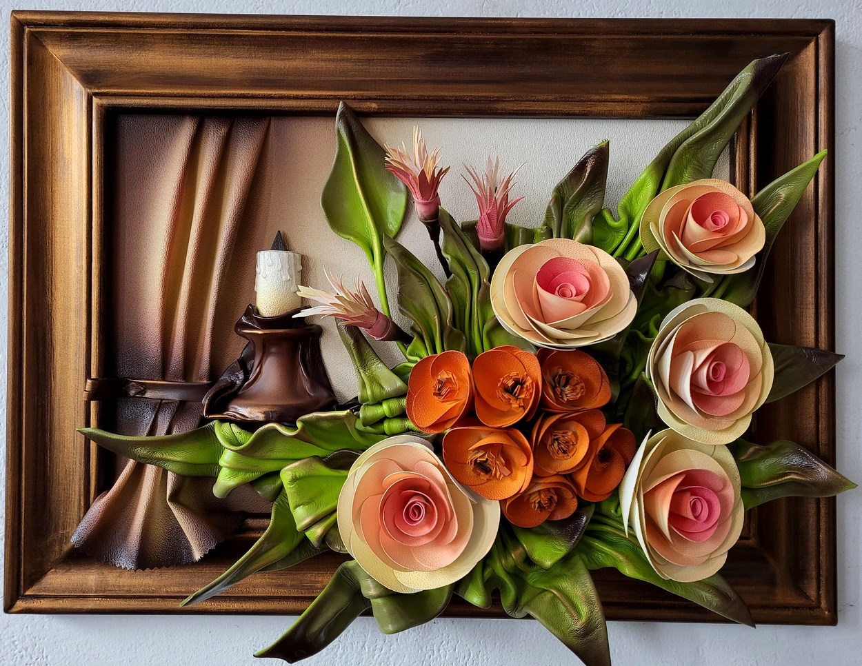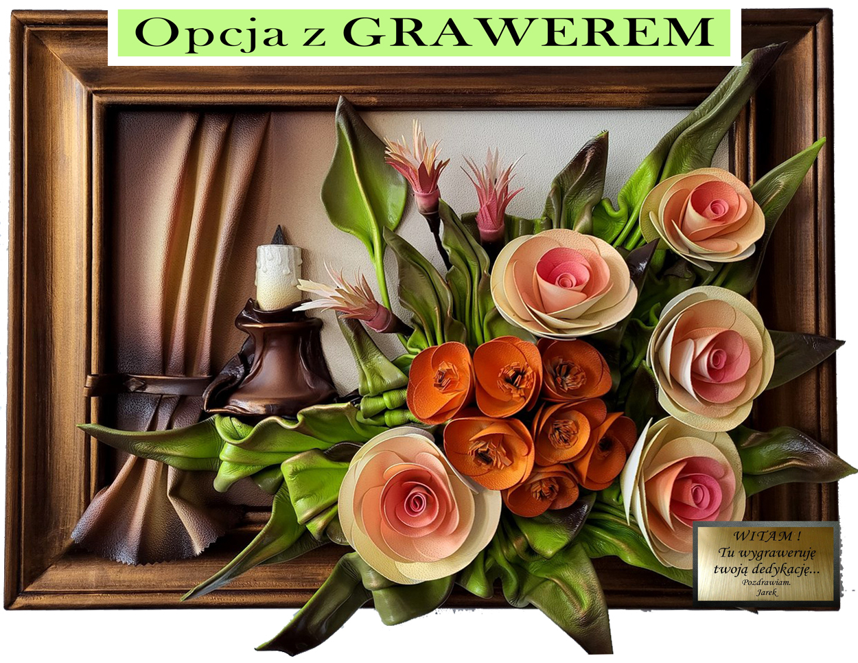 Obraz z kwiatami i świecą w złotej antycznej ramie - prezent na urodziny JUBILEUSZ czy EMERYTURĘ