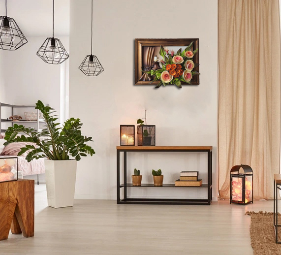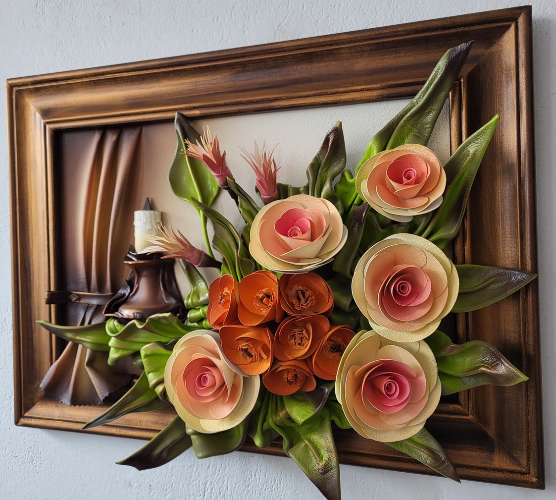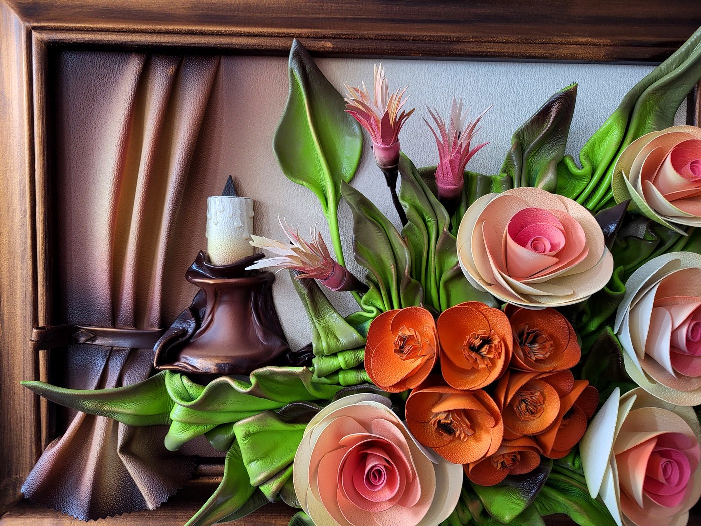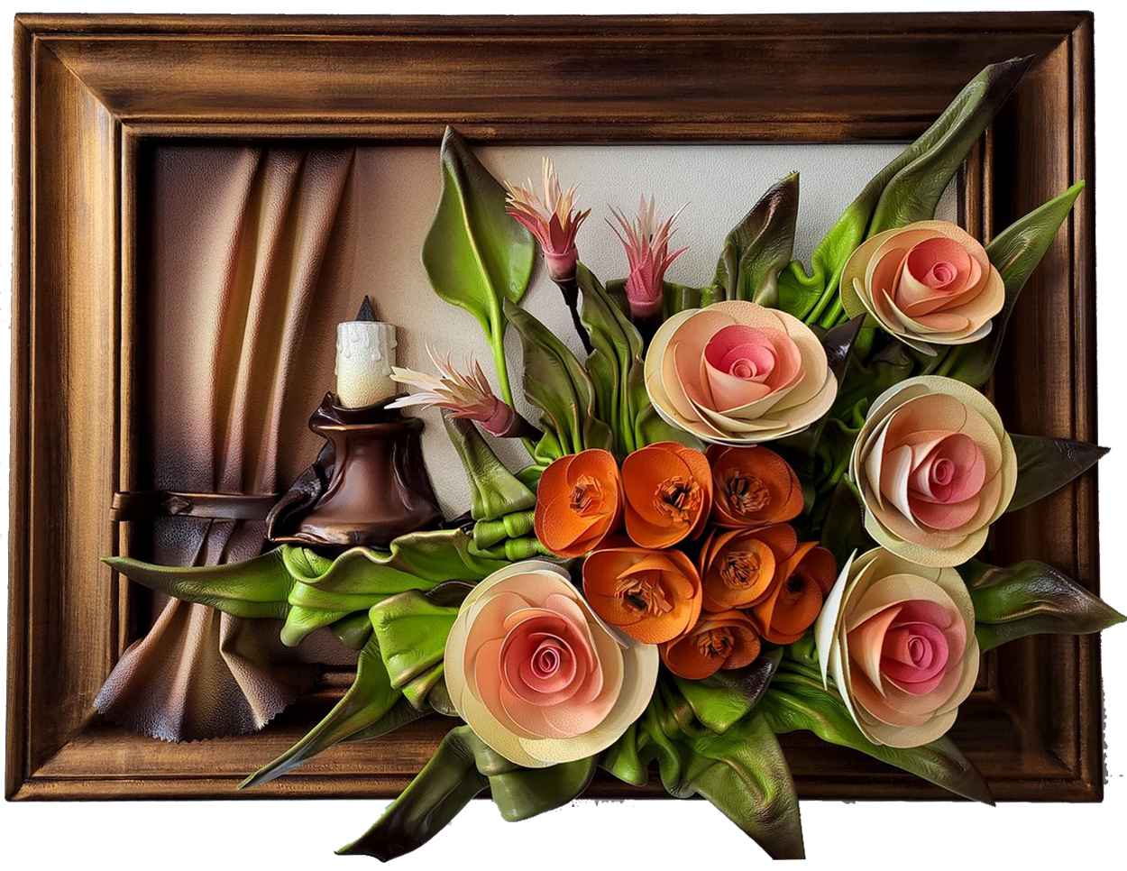 Obraz z kwiatami i świecą w złotej antycznej ramie - prezent na urodziny JUBILEUSZ czy EMERYTURĘ