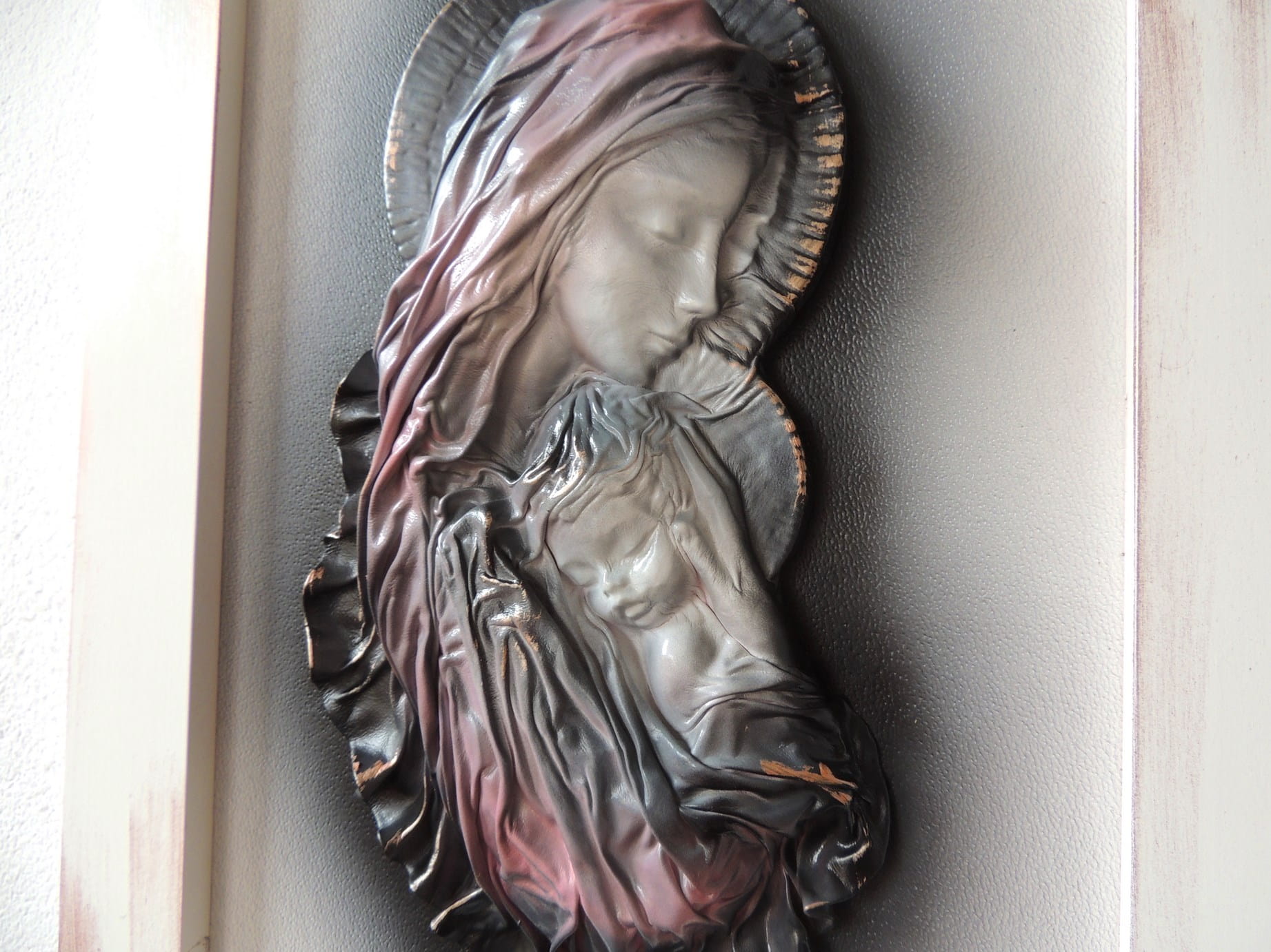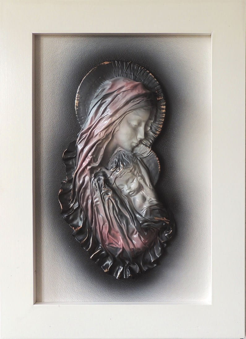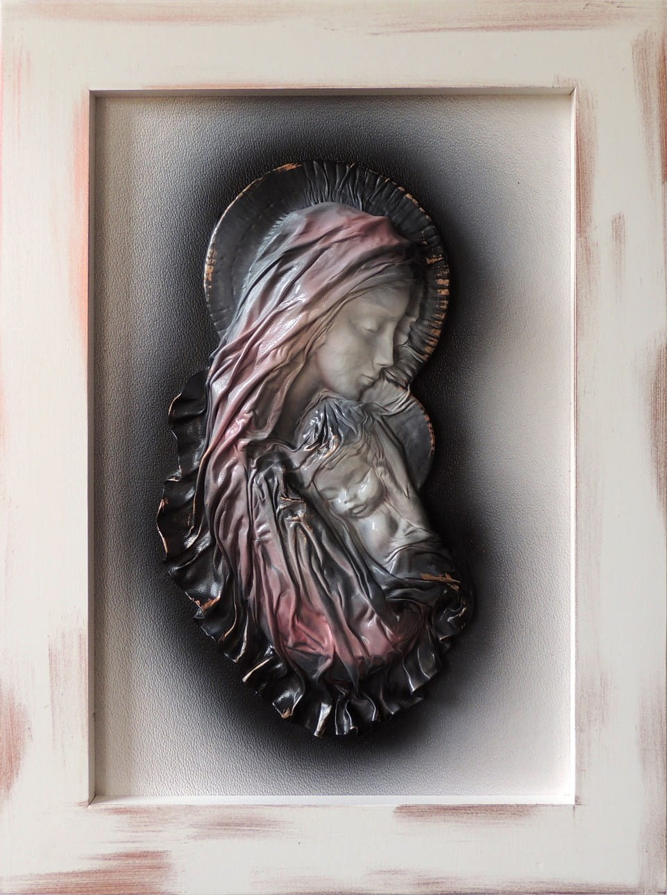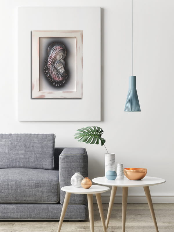 Obraz z płaskorzeźbą Maryji w drewnianej białej ramie - S3-14