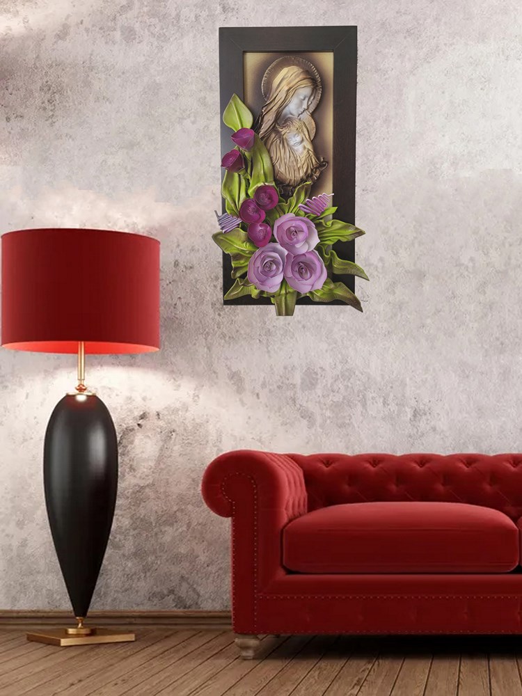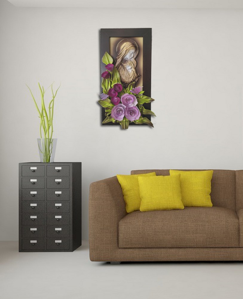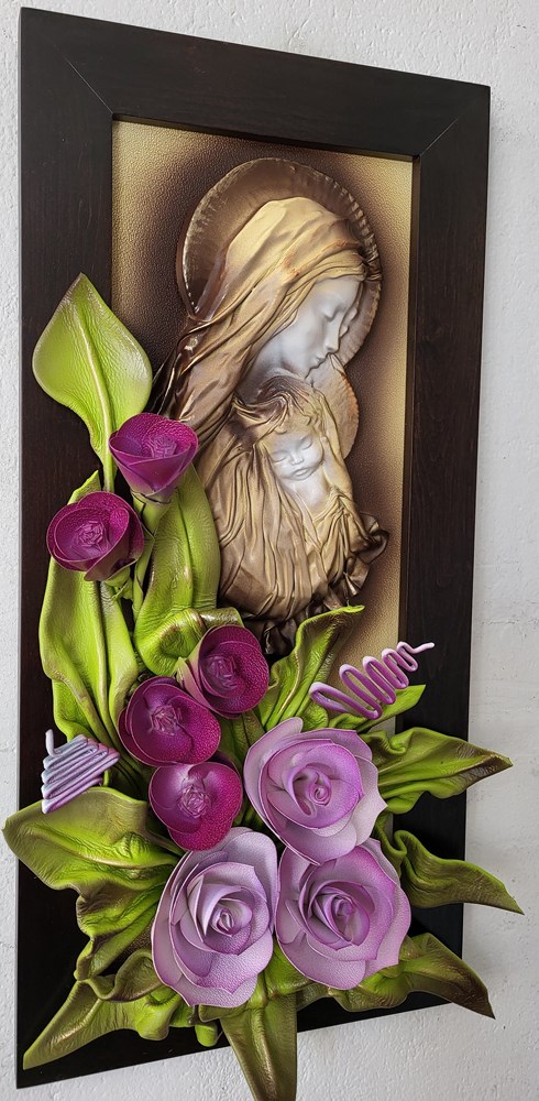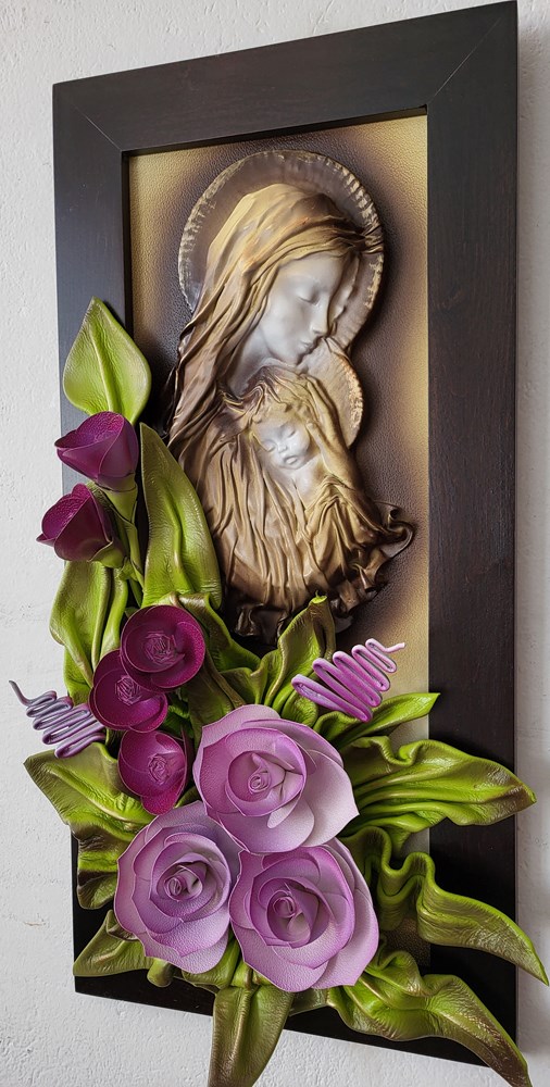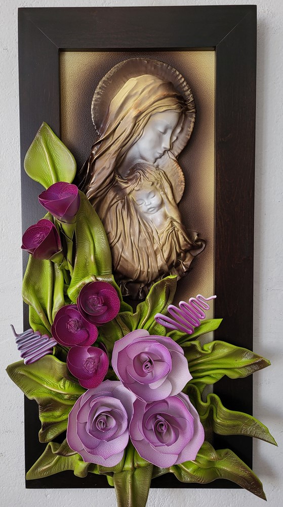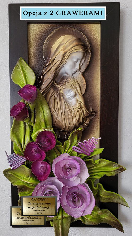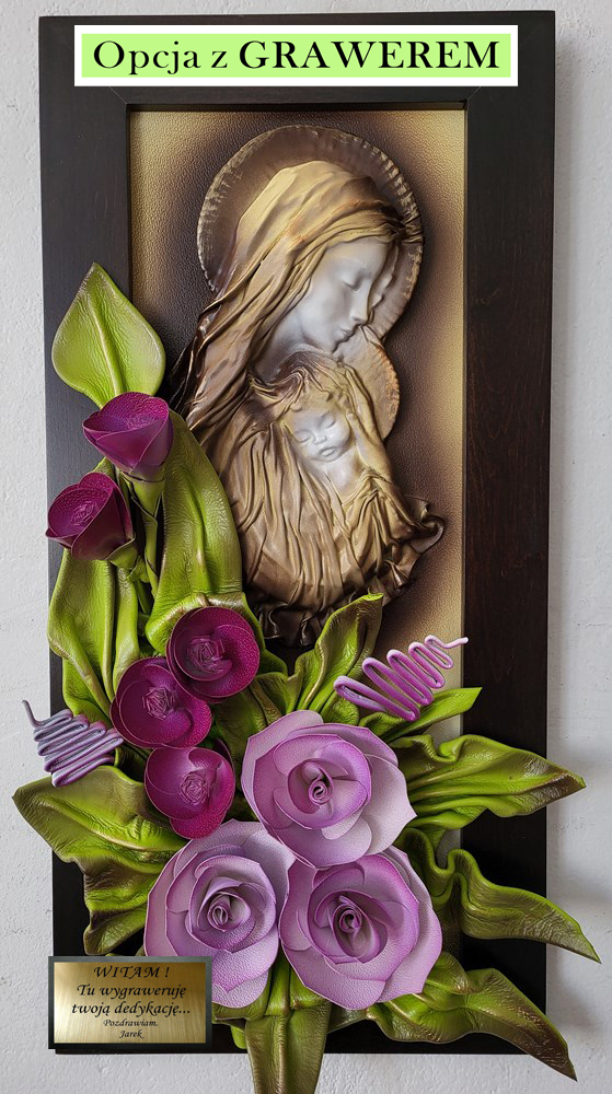Obraz z płaskorzeźbą Matki Bożej - fioletowe kwiaty - drewniana rama w kolorze orzechu PREZENT