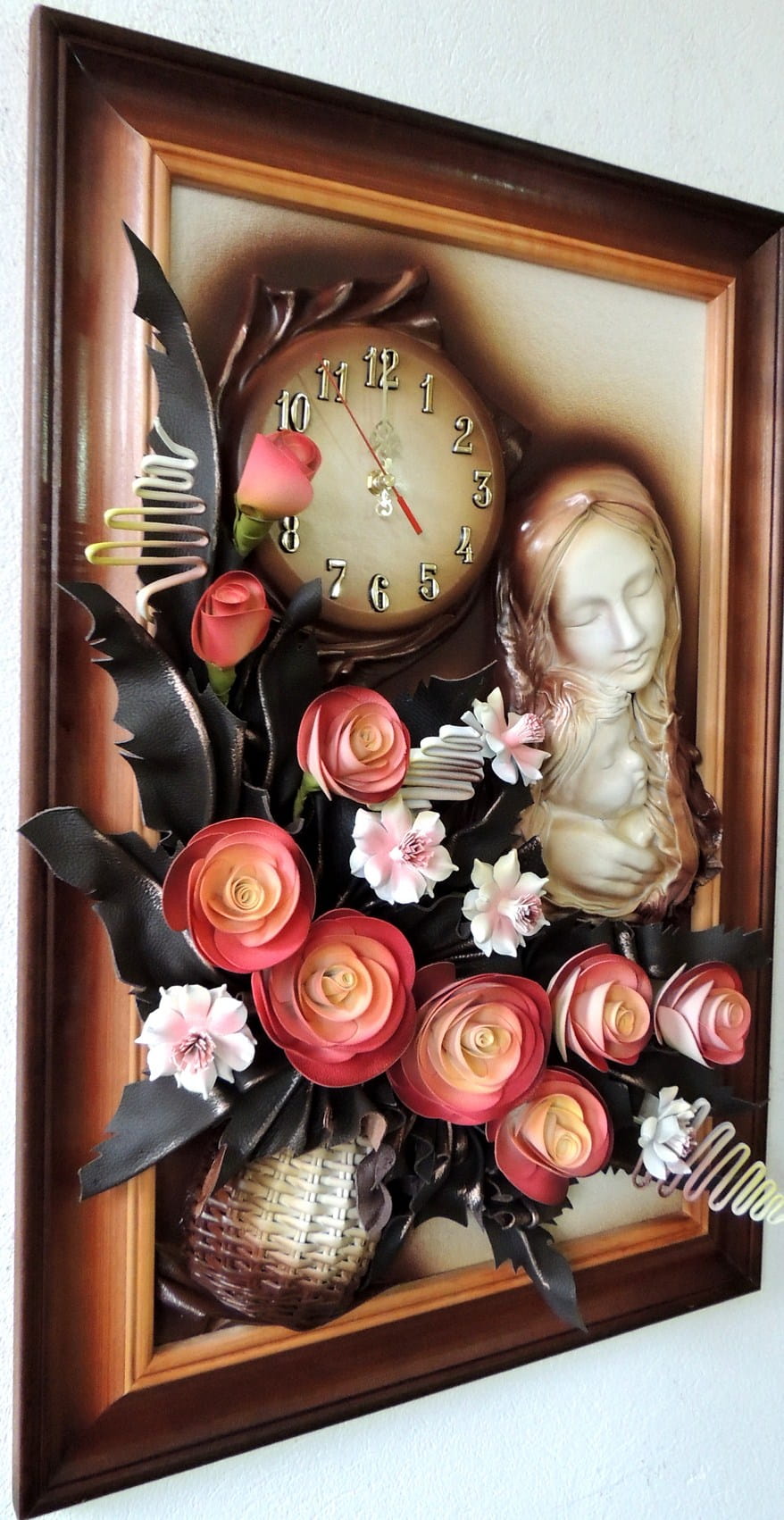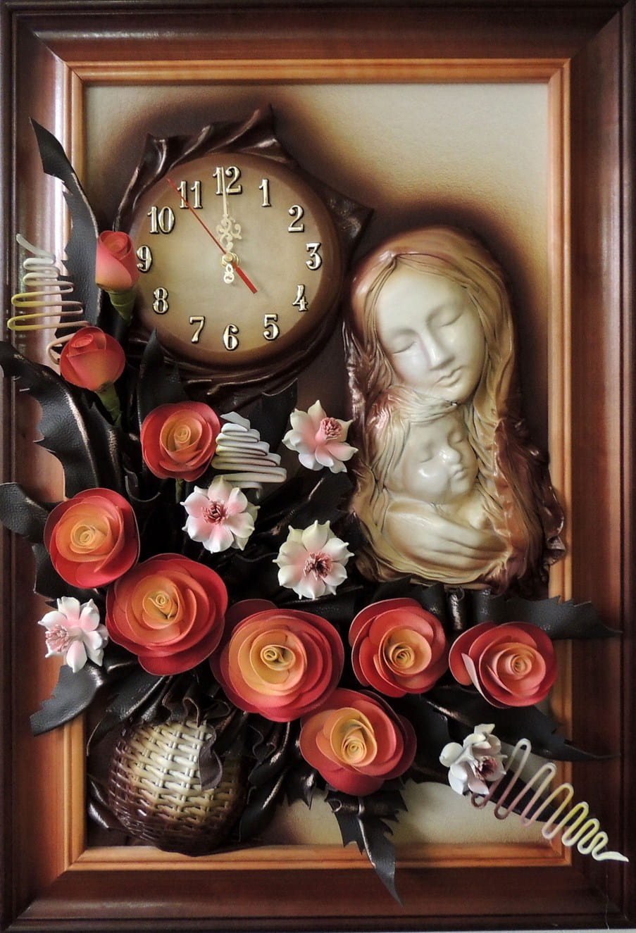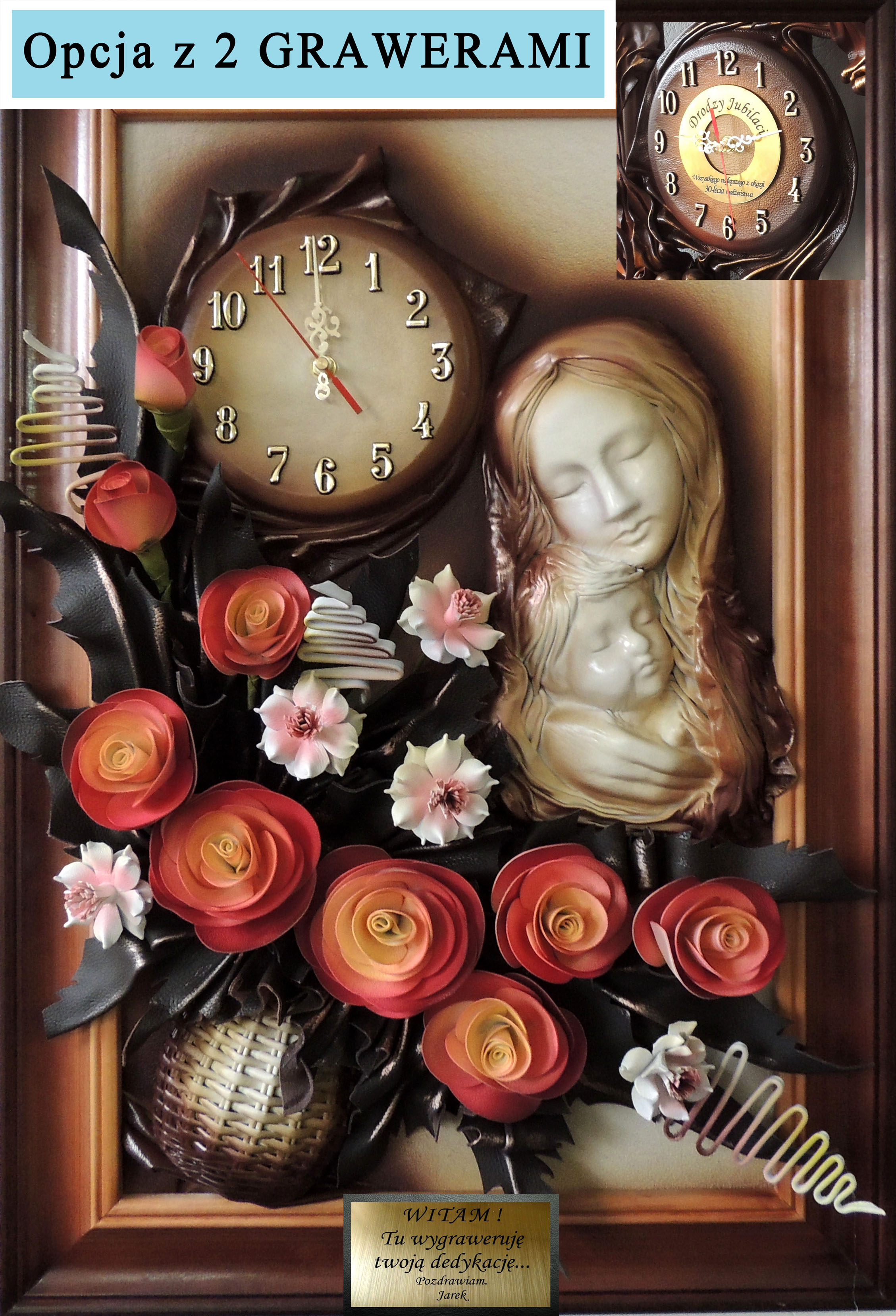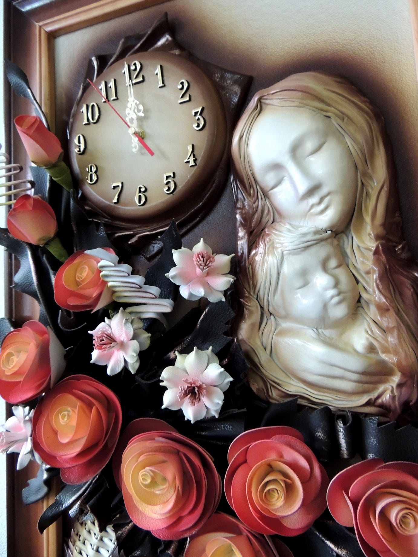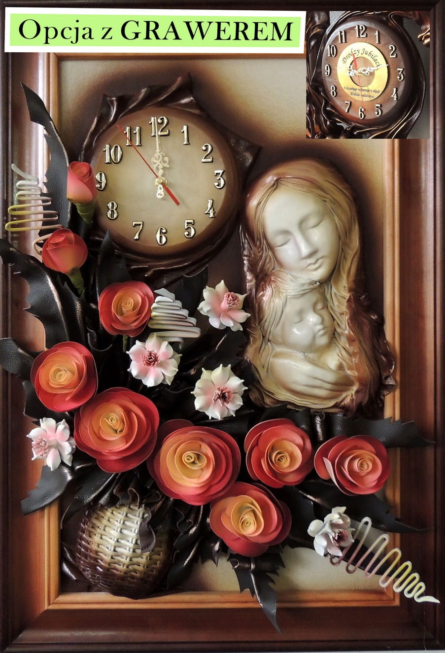 Obraz z płaskorzeźbą Matki Bożej z bukietem kwiatów i zegarem - RĘKODZIEŁO na prezent