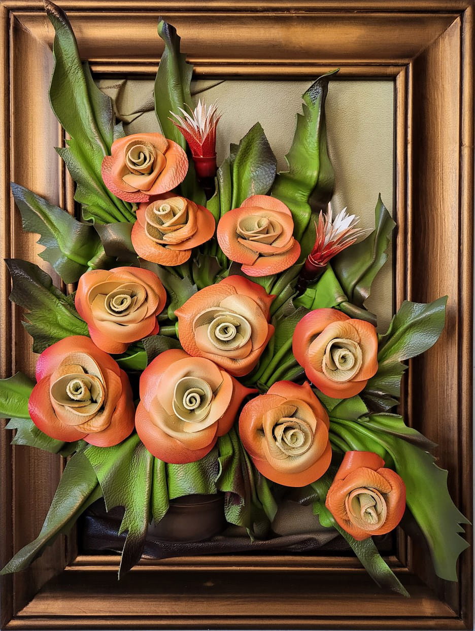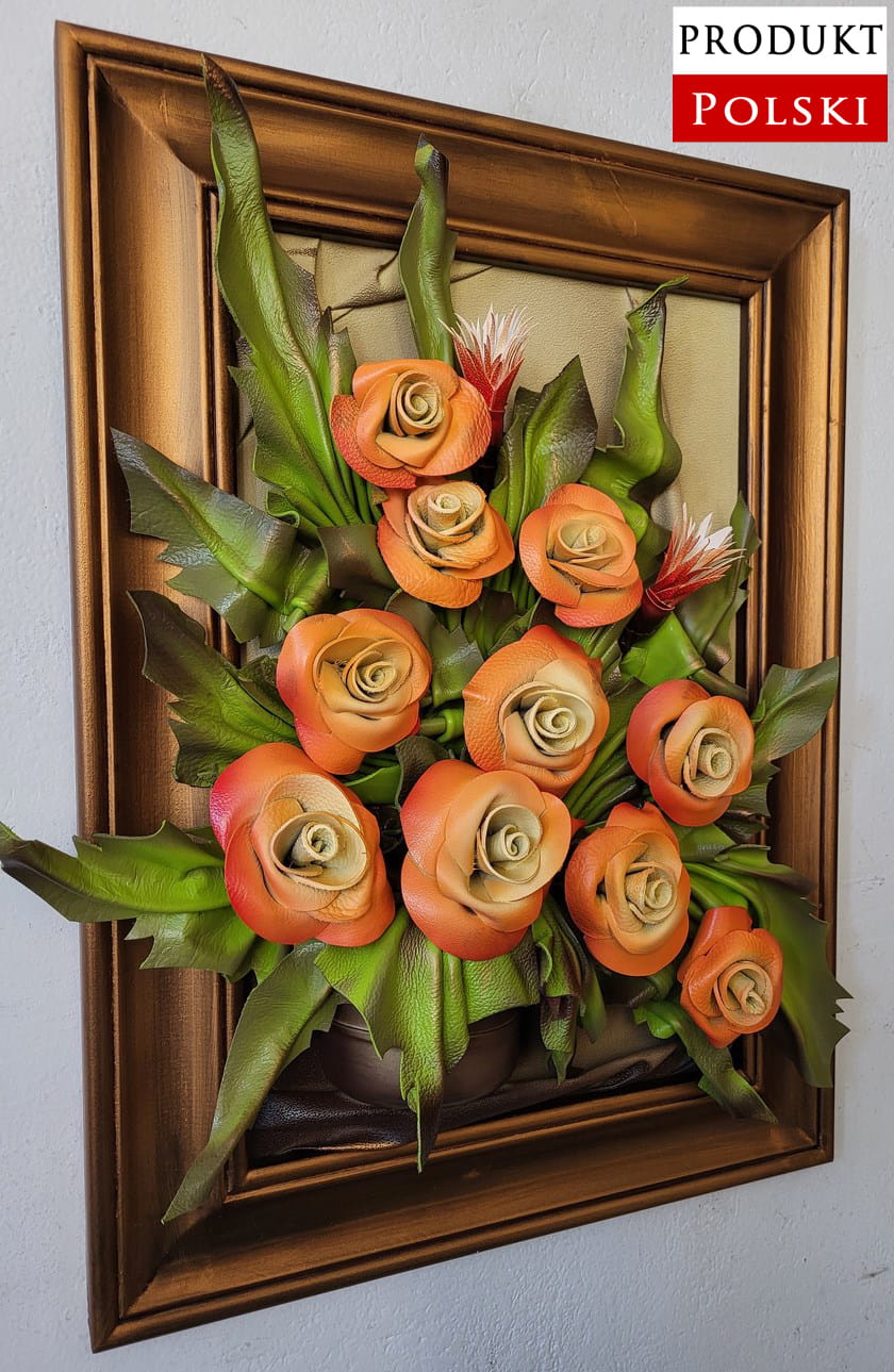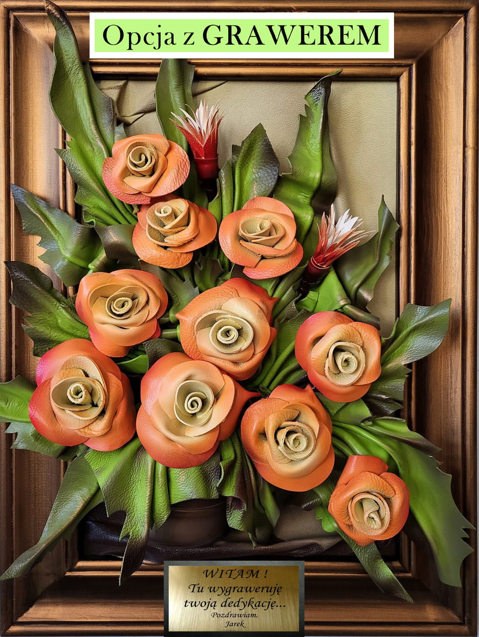 Obraz z pomarańczowymi różami w wazonie ze skóry - Prezent na JUBILEUSZ i inne okazje
