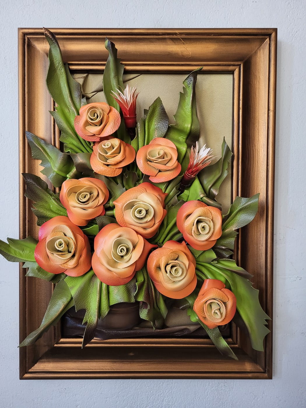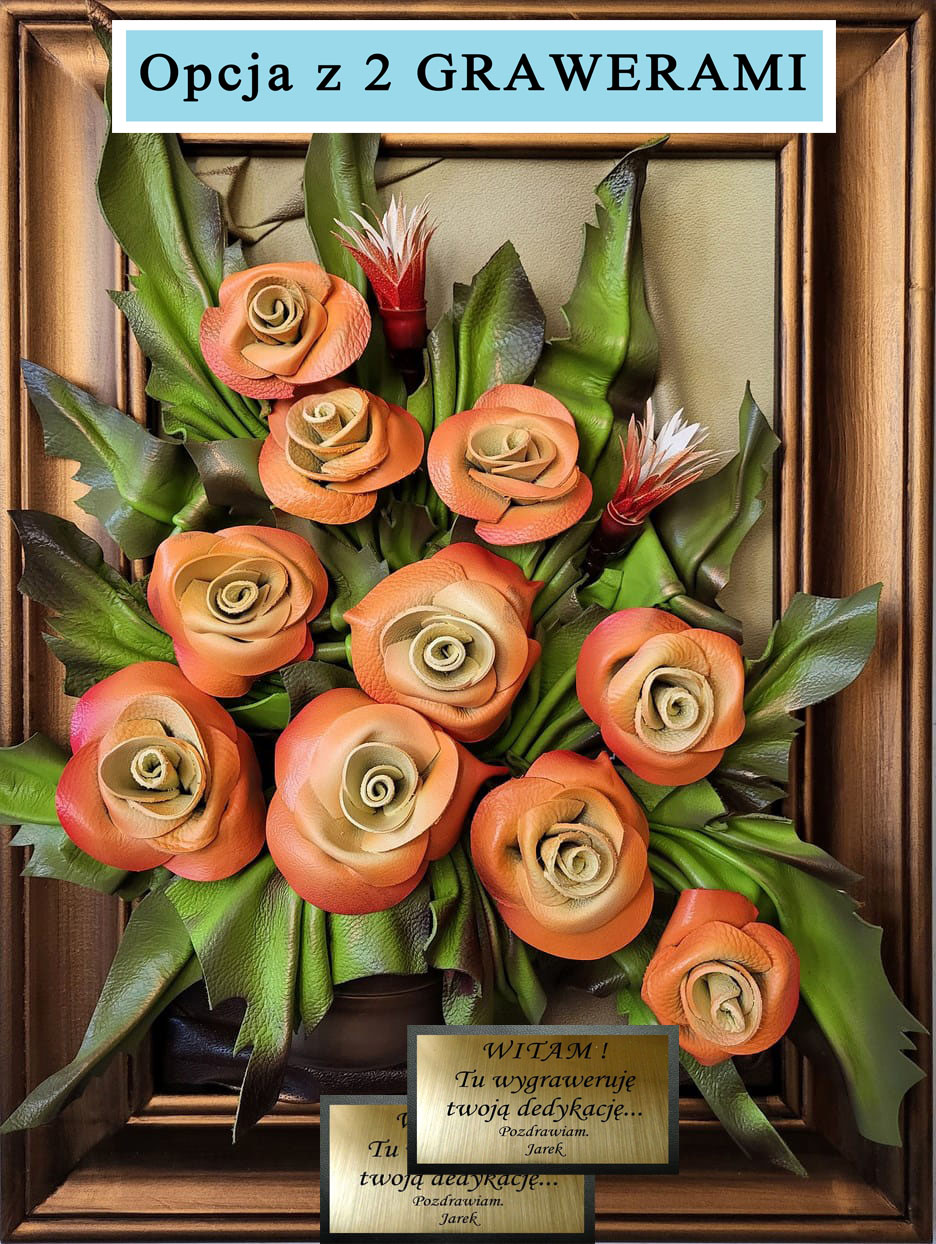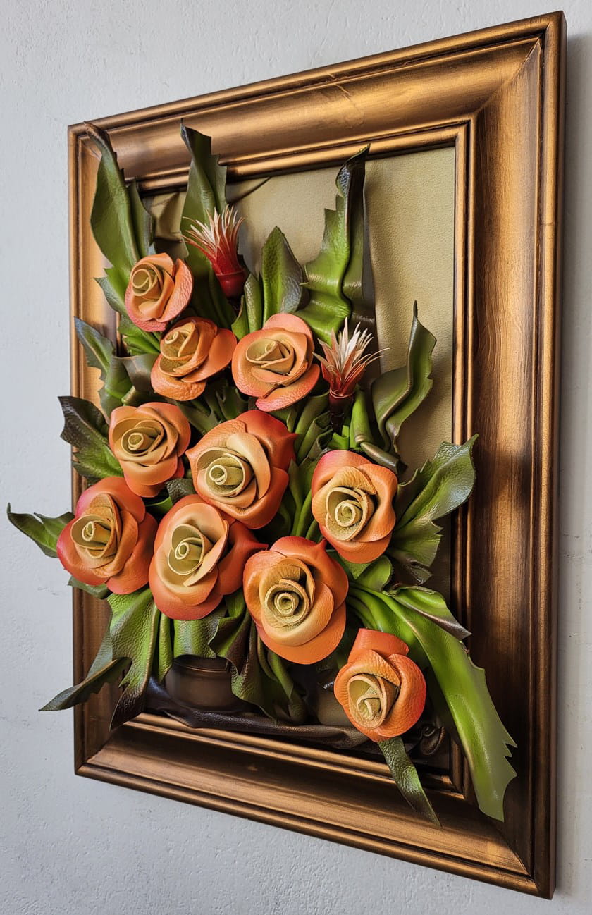 Obraz z pomarańczowymi różami w wazonie ze skóry - Prezent na JUBILEUSZ i inne okazje