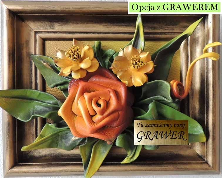 Obraz z różyczką ze skóry w pozłacanej ramie RĘKODZIEŁO