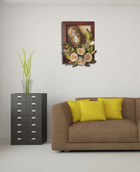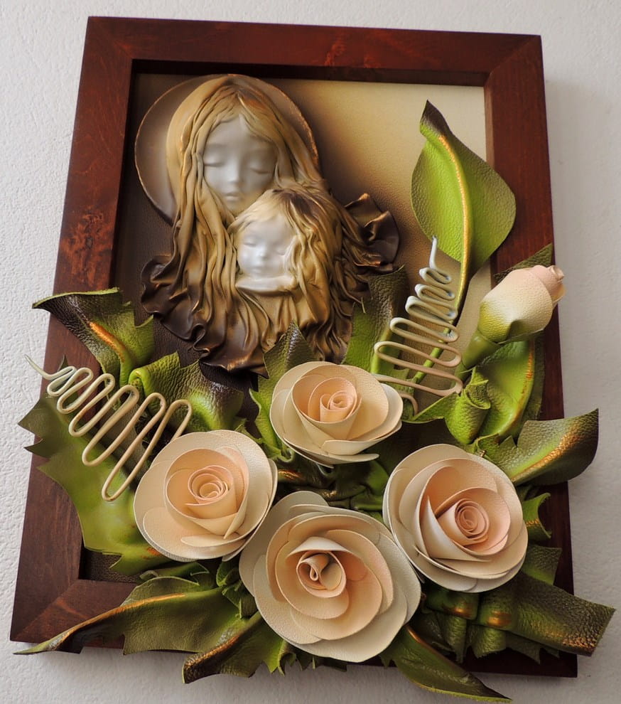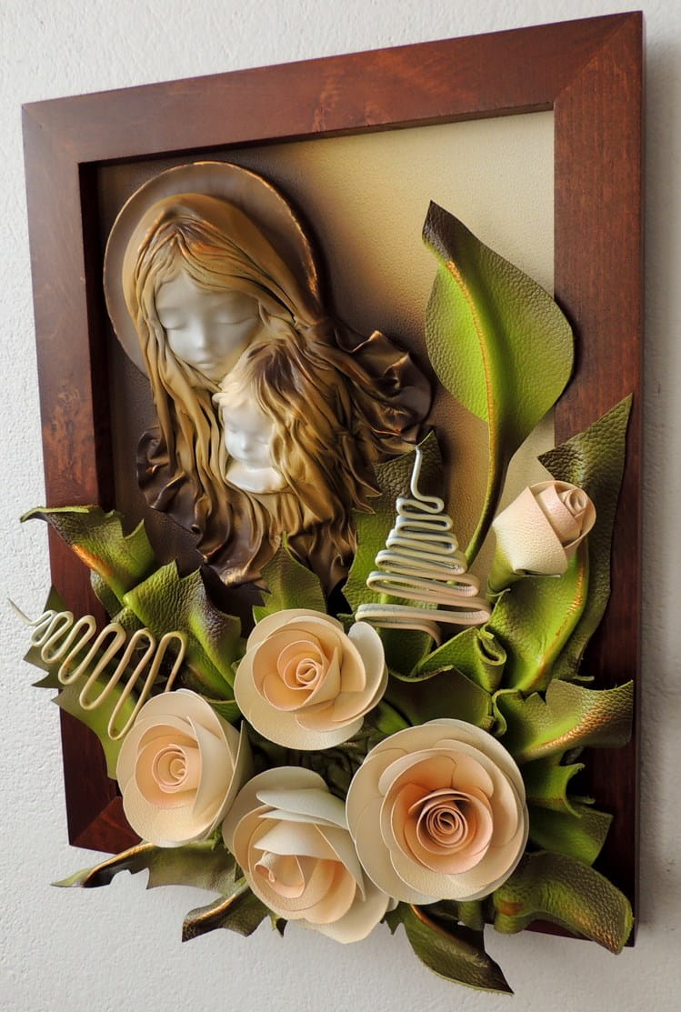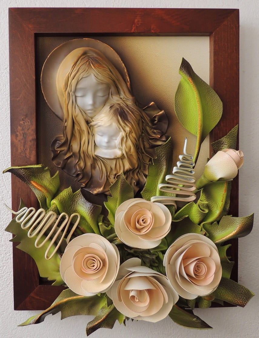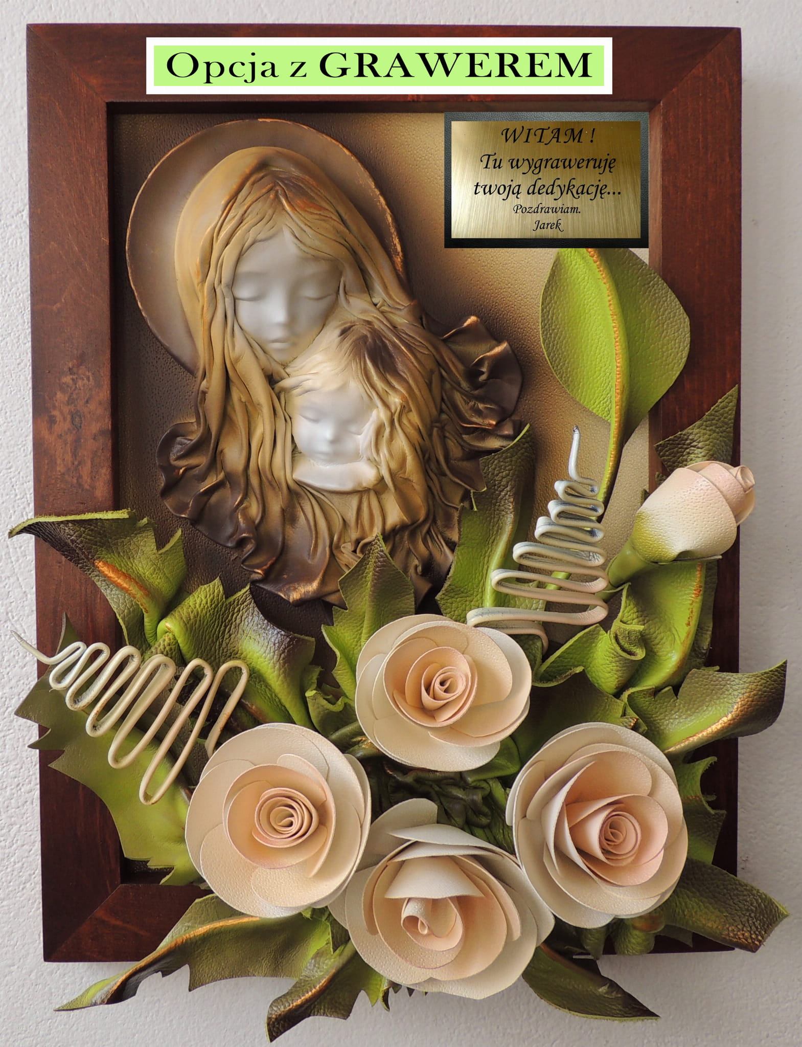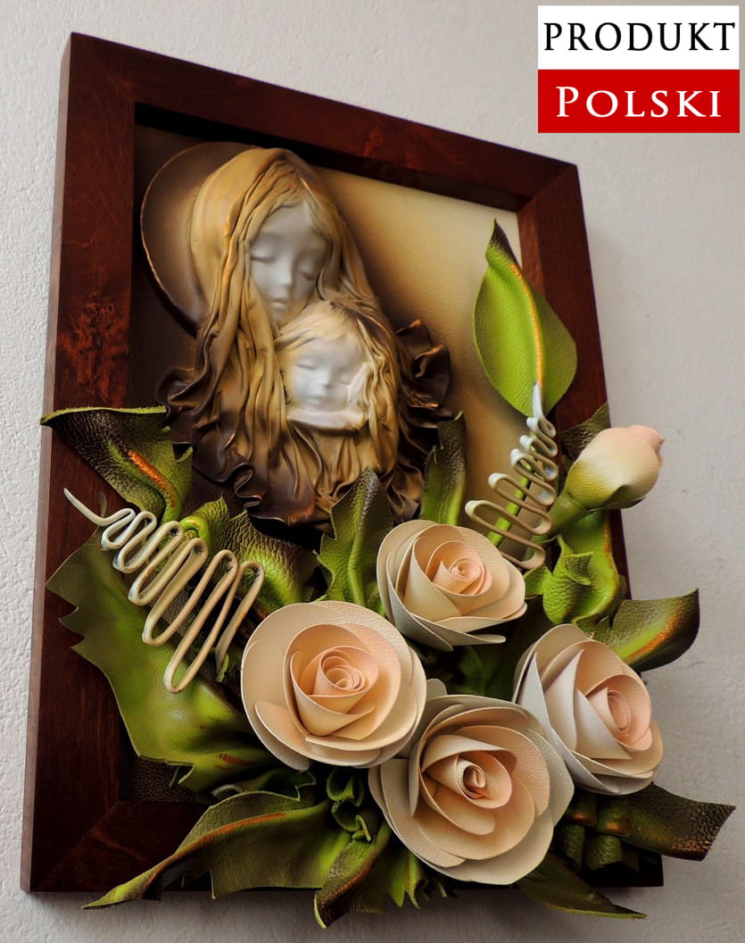 Obrazek z Maryją + delikatne budyniowe kwiatuszki ze skóry - K2S-1