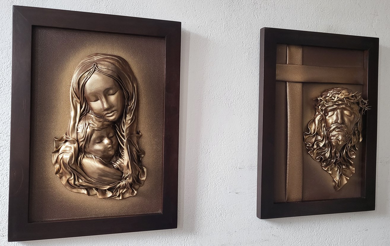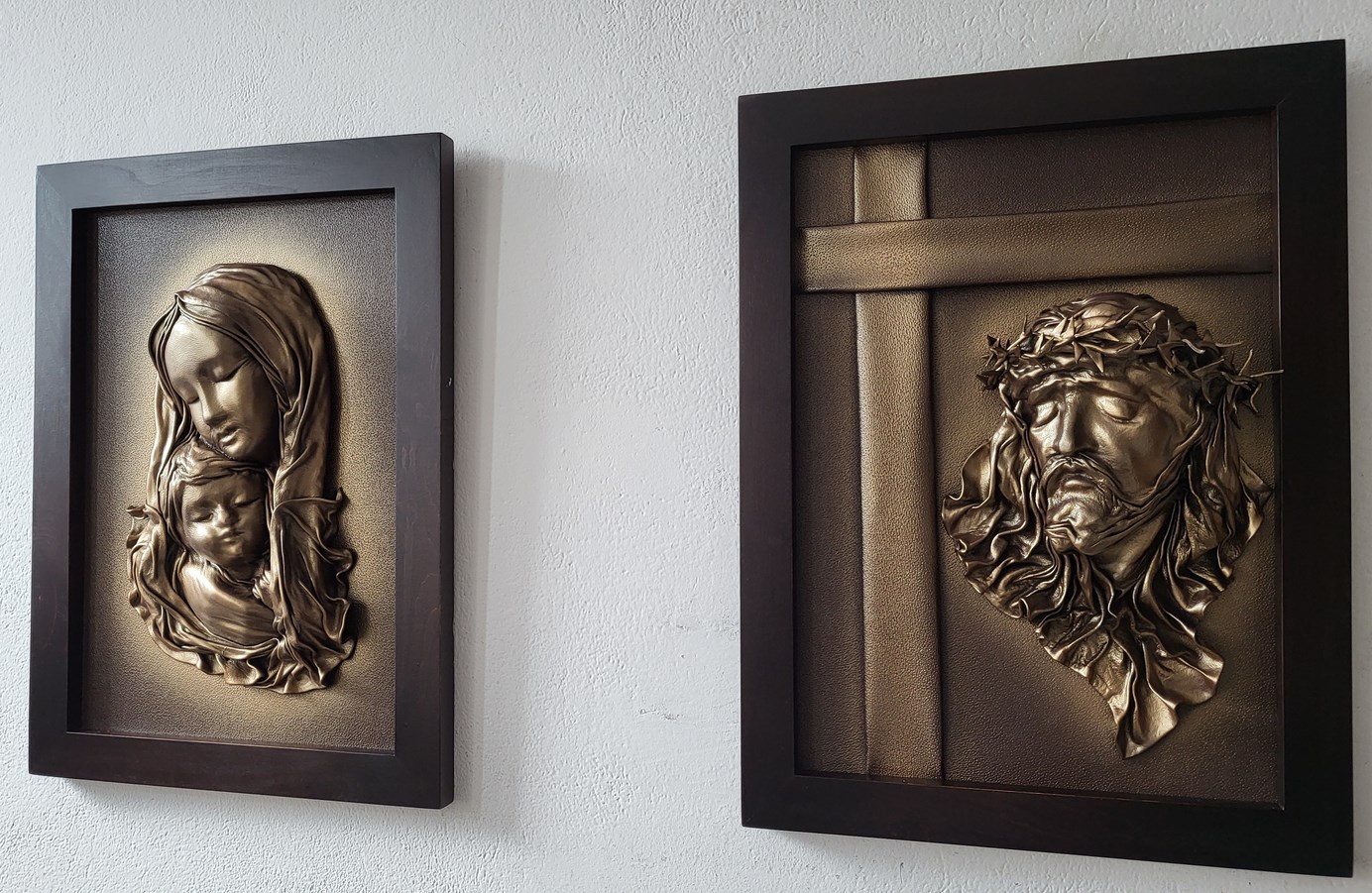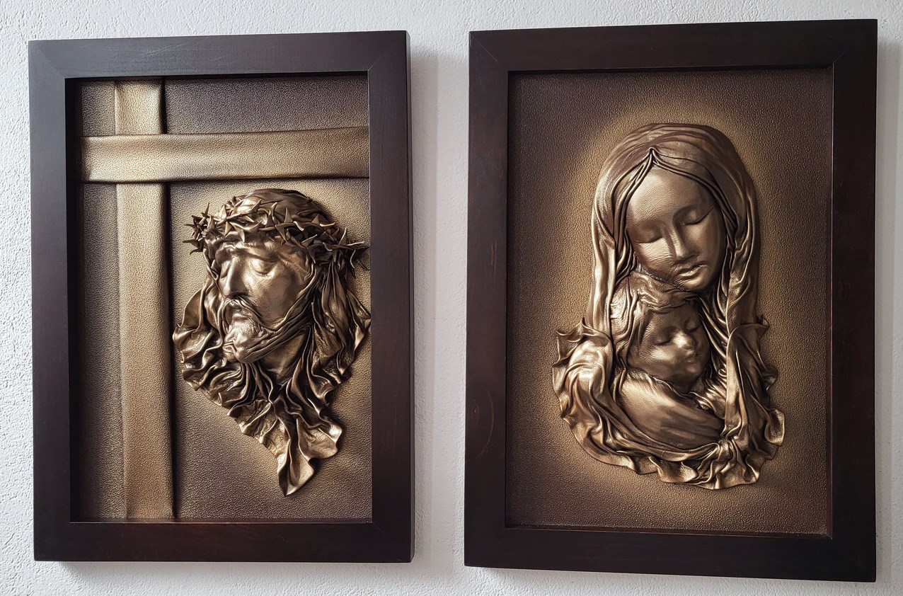 Obrazy z płaskorzeźbami Maryii i Jezusa