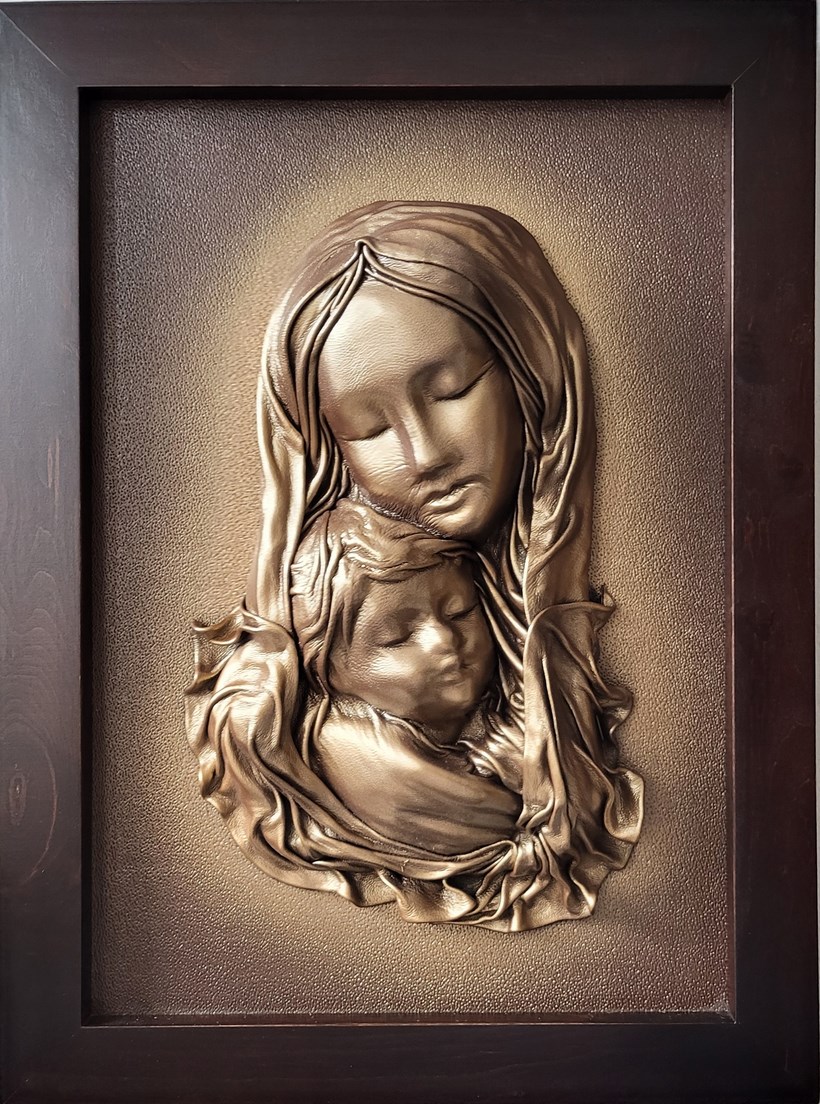 Obrazy z Maryją i Jezusem - komplet obrazów ze skóry w drewnianej ramie