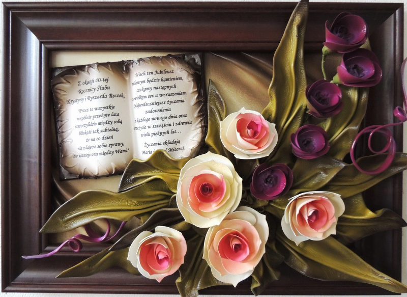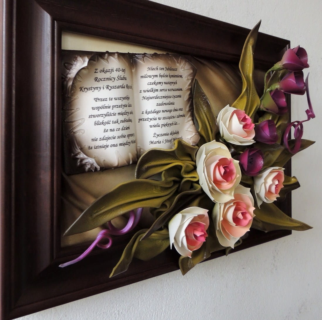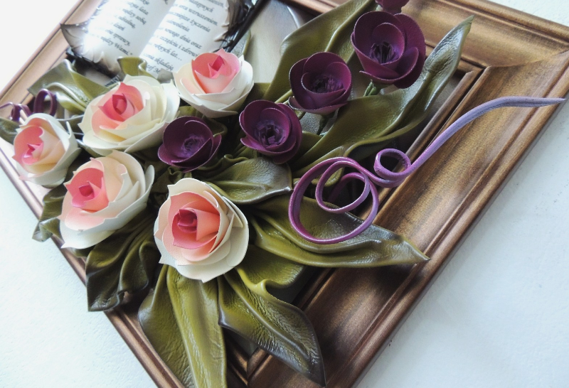 PIĘKNY UNIWERSALNY OBRAZ ZE SKÓRY Z KWIATAMI I DEDYKACJĄ - K5D-4