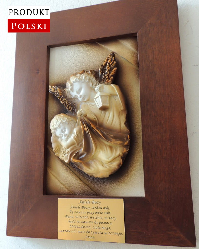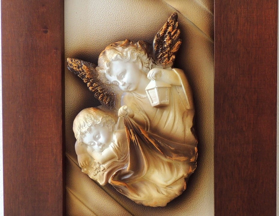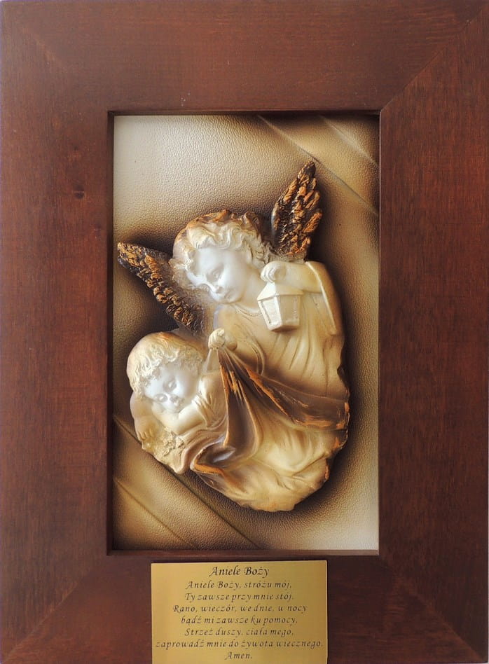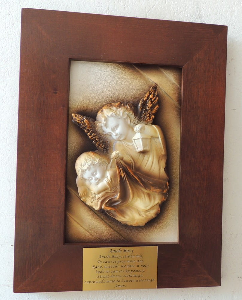 Obraz z posrebrzaną płaskorzeźbą Anioła Stróża.