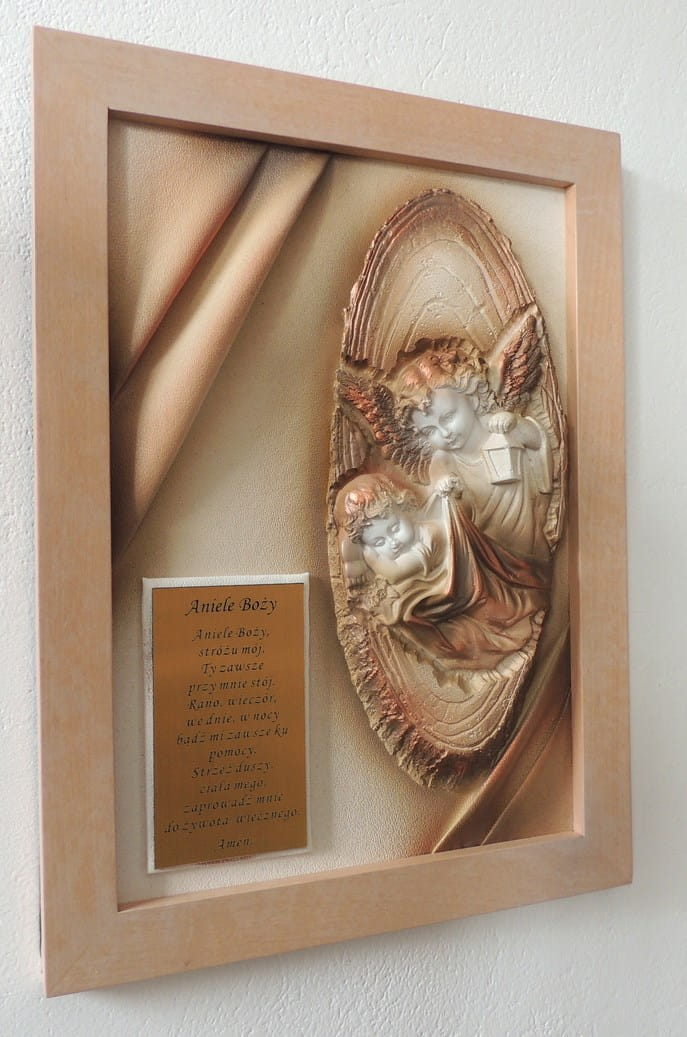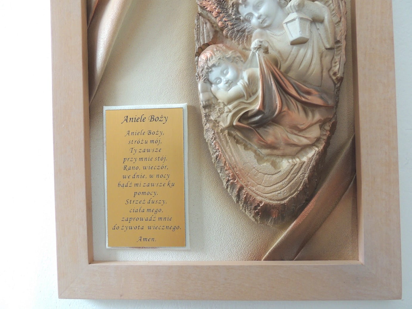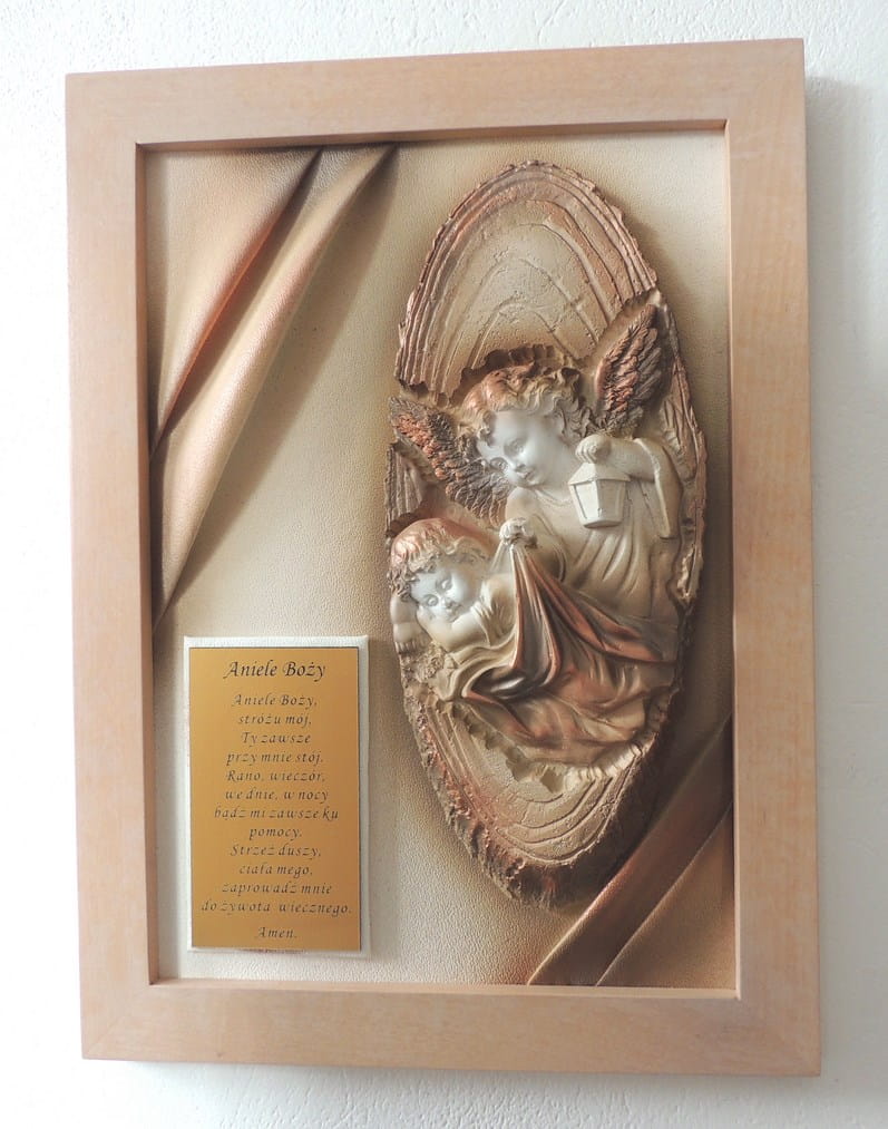 Obraz z posrebrzaną płaskorzeźbą Anioła Stróża.