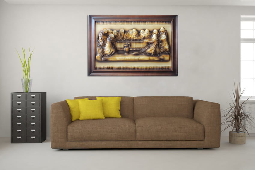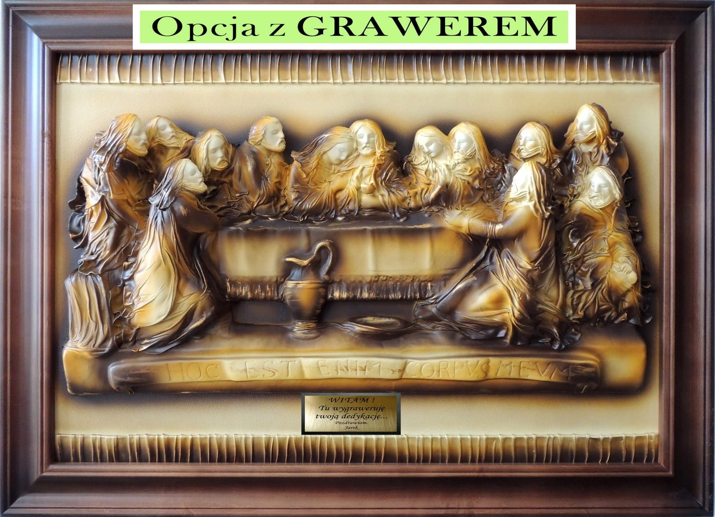 Na tle obrazu w jednym z narożników zamieszczamy złotą tabliczkę z grawerem,