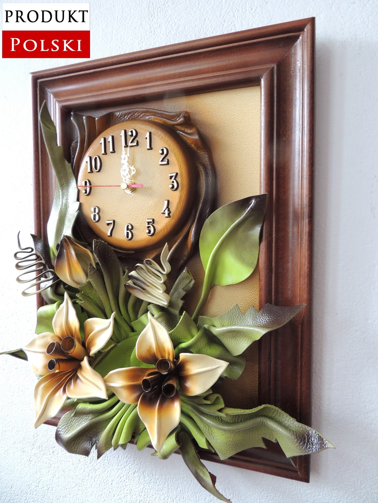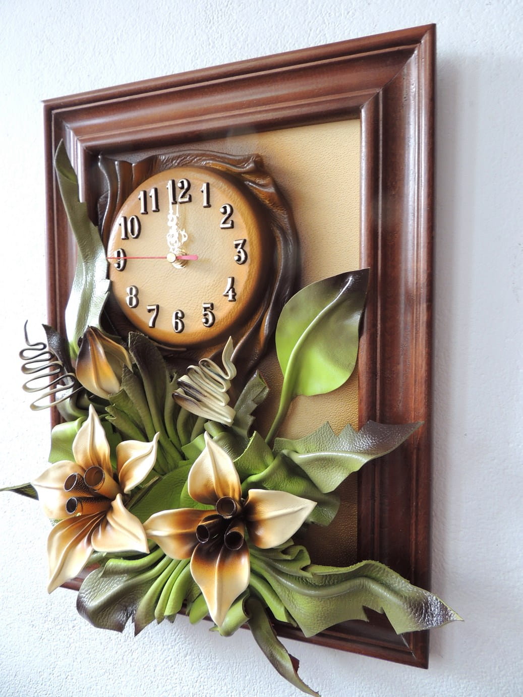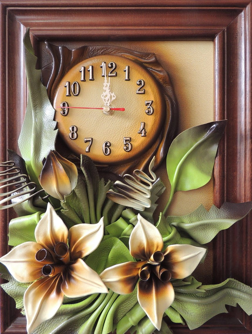 Obrazek ze skóry z liliami + zegar