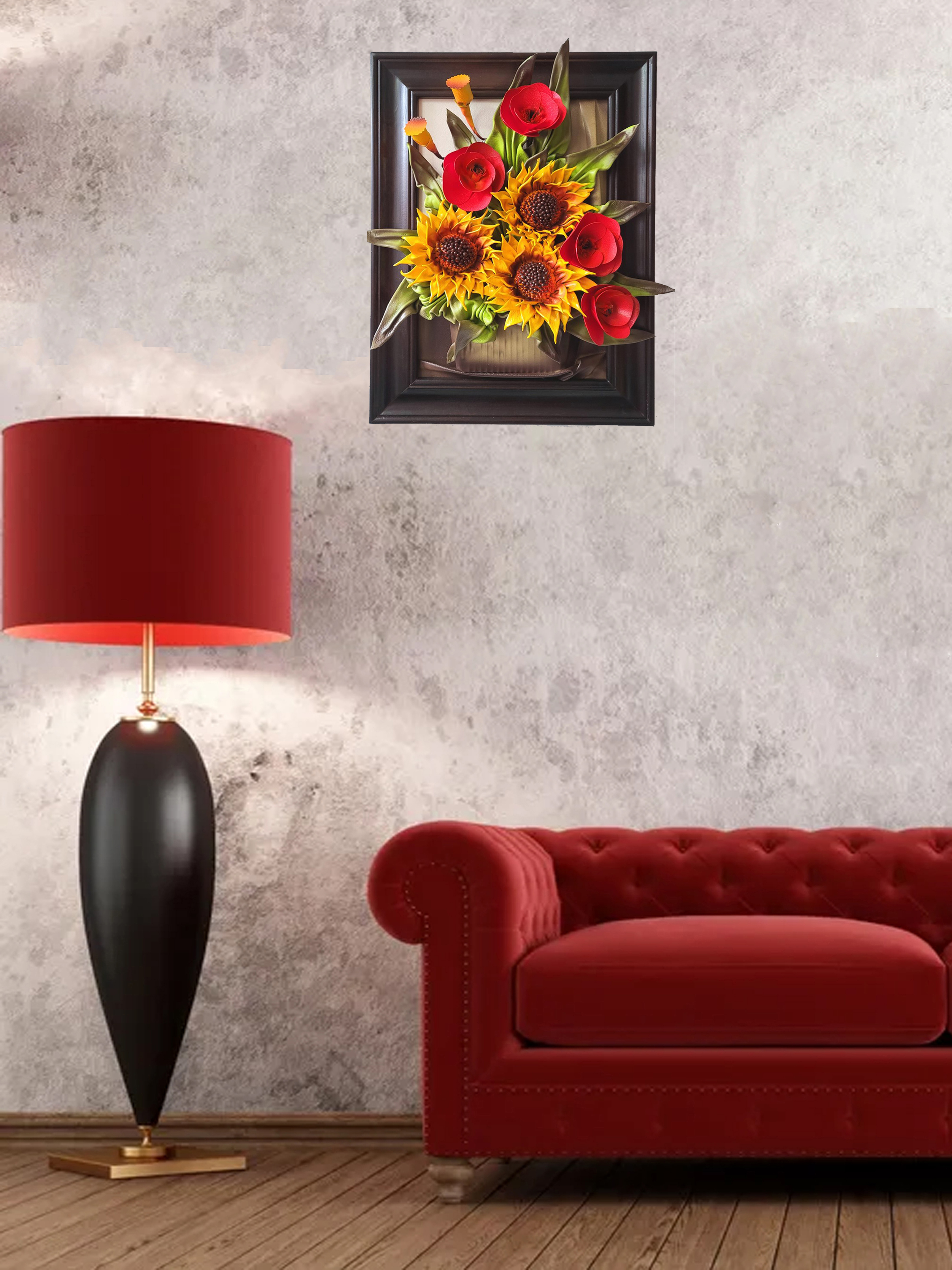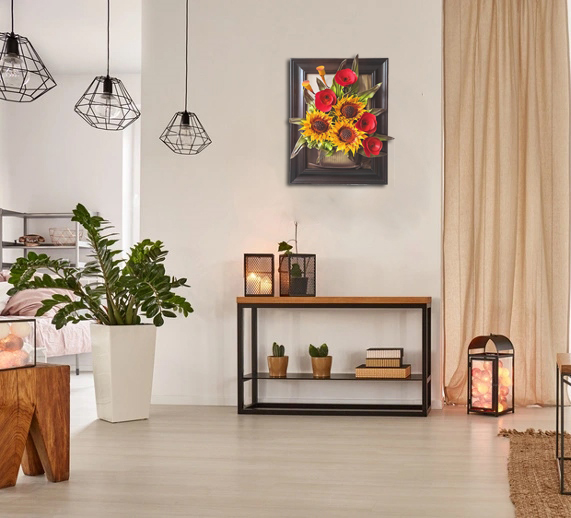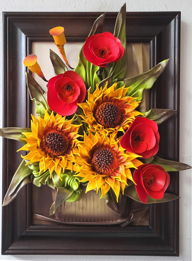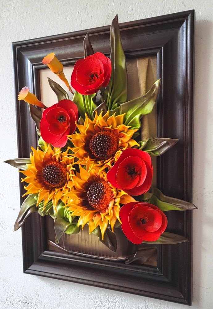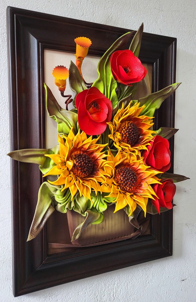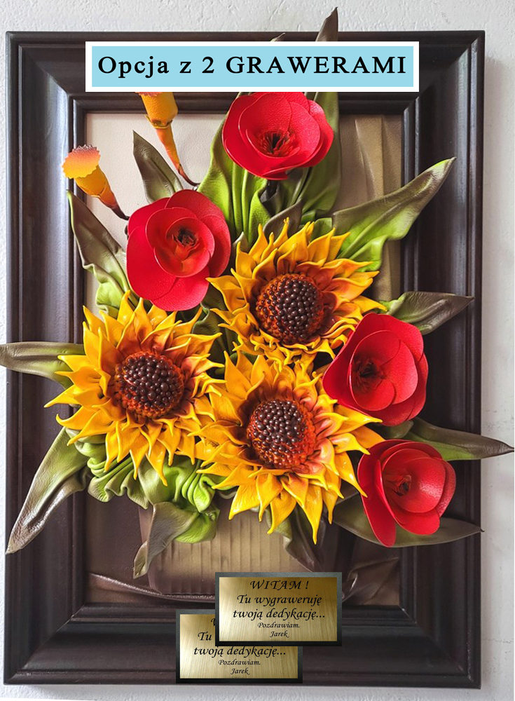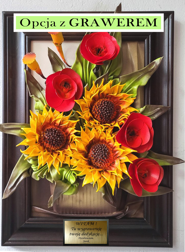Słoneczni i maki - obraz skórzany ręcznie wykonany - na prezent dla kobiety z okazji urodzin JUBILEUSZ
