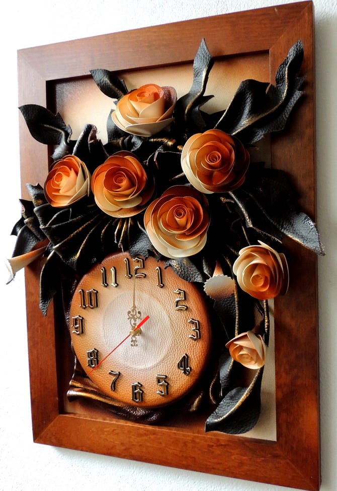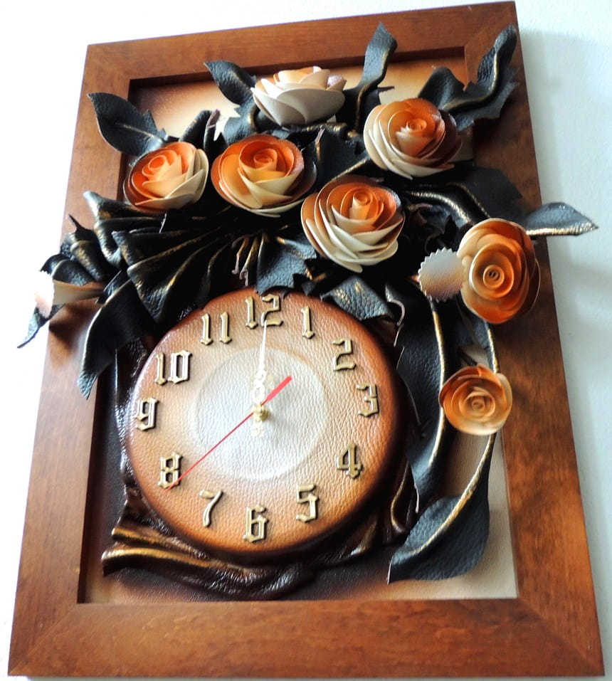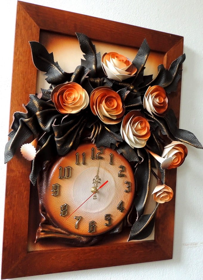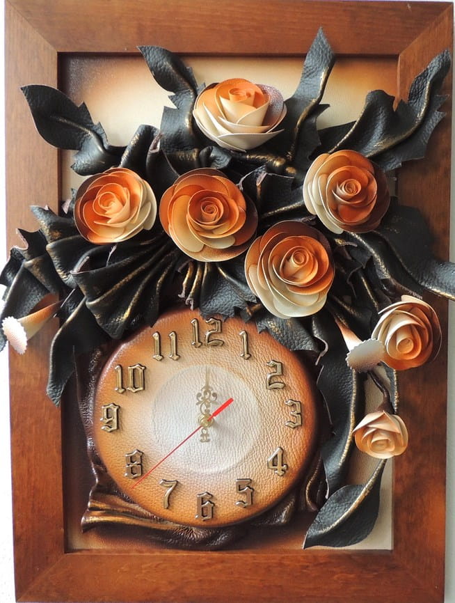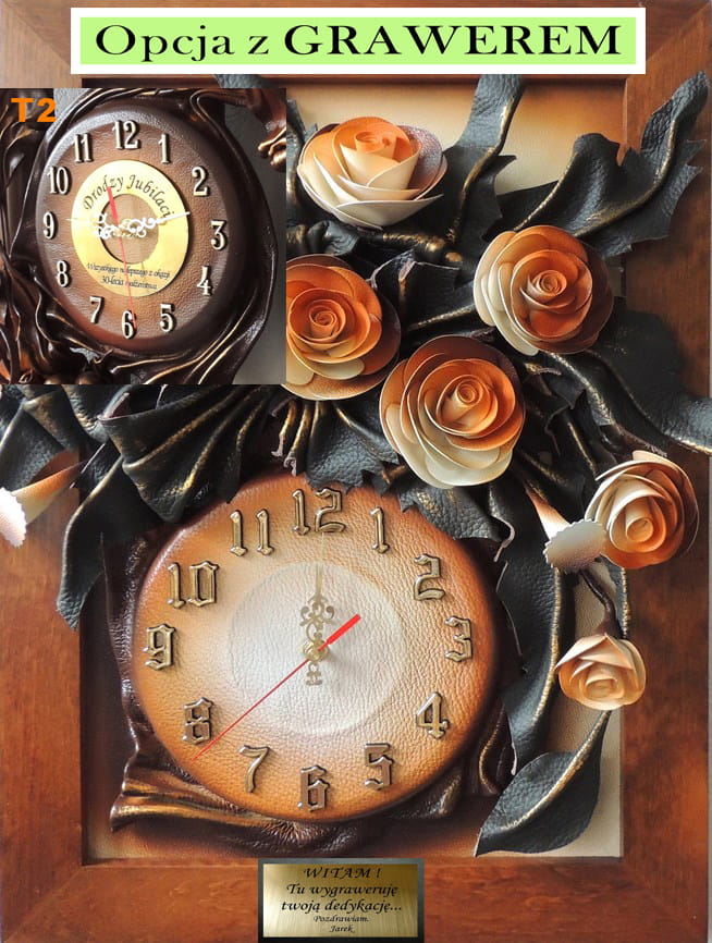 Zegar ścienny skórzany z różami - rama drewniana w kolorze złoty dąb - 55x40cm - K5Z-6