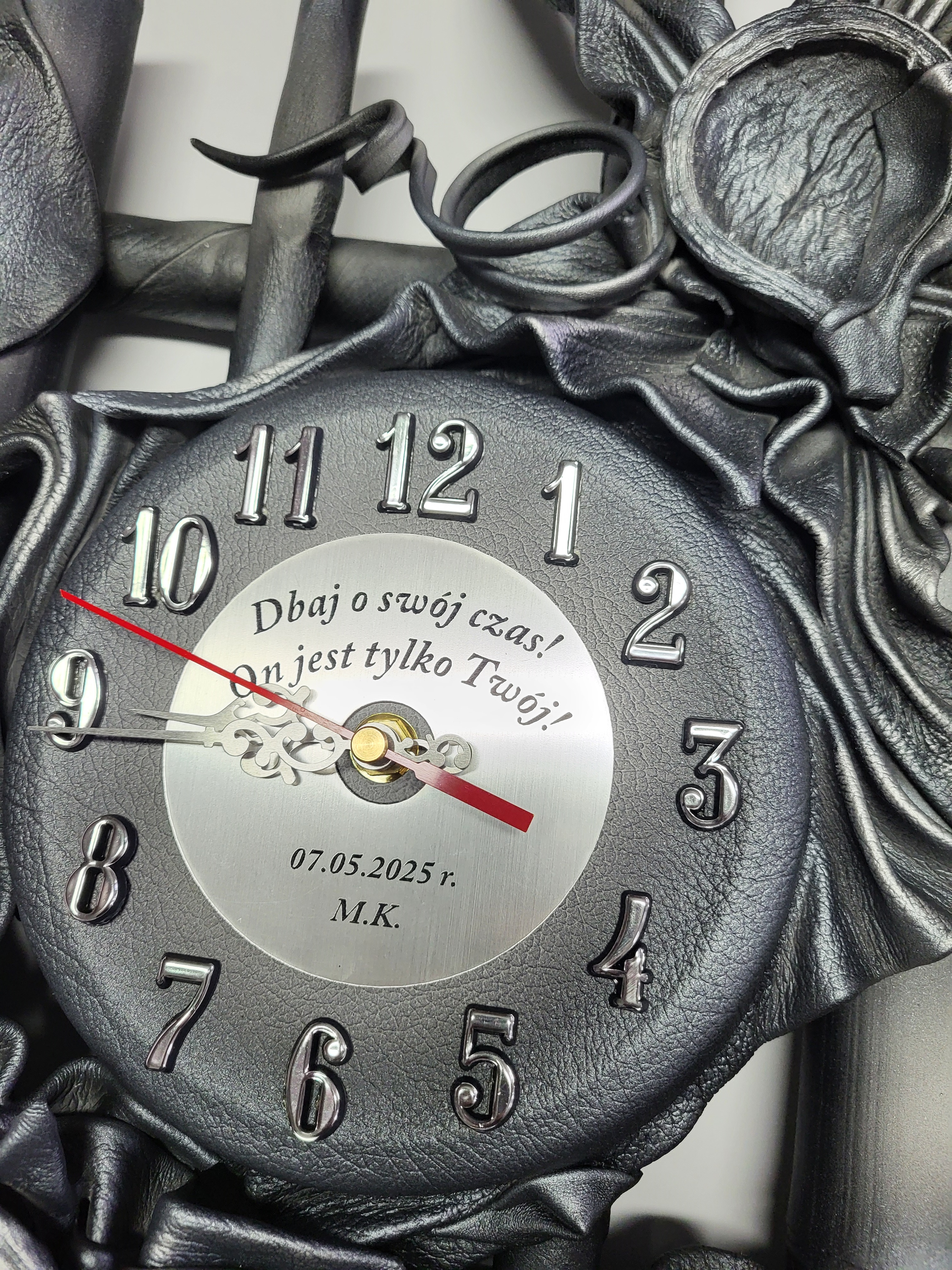 Na tarczy zegar zamieszczamy złoty pierścień z grawerem.