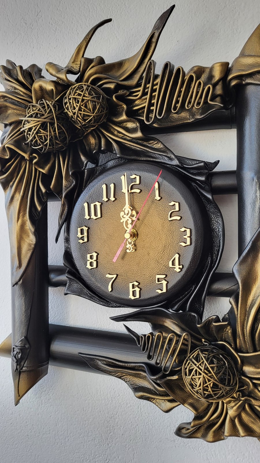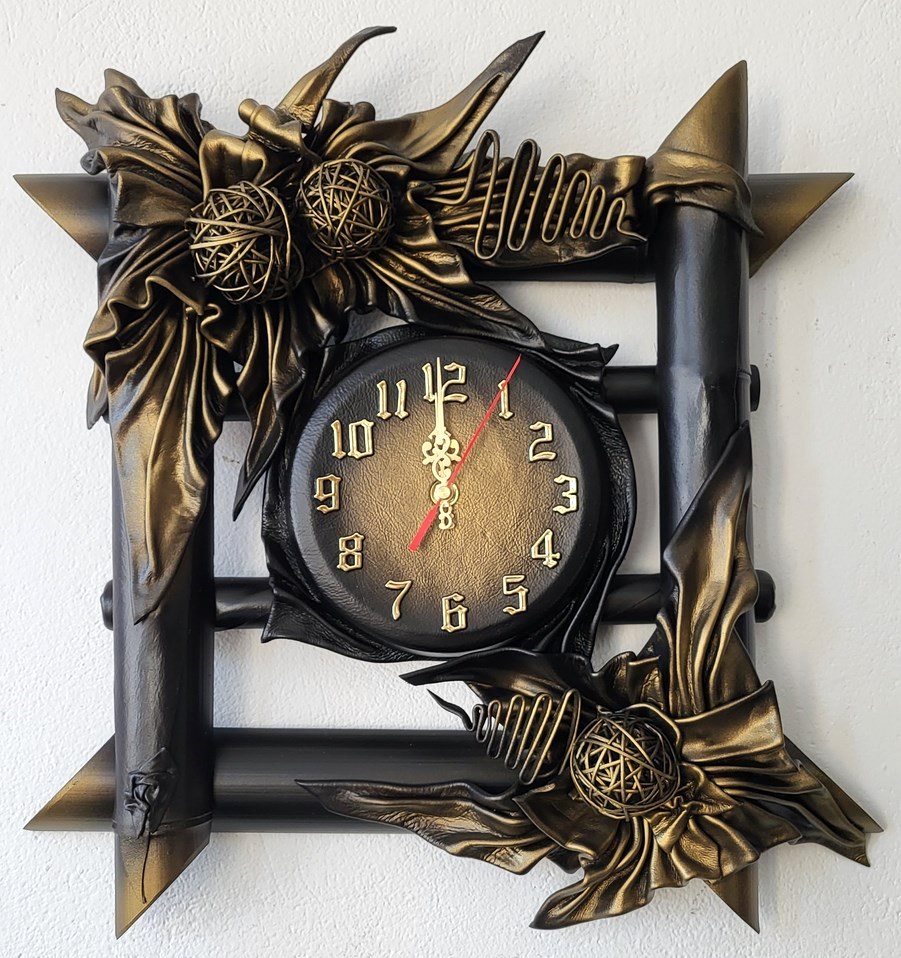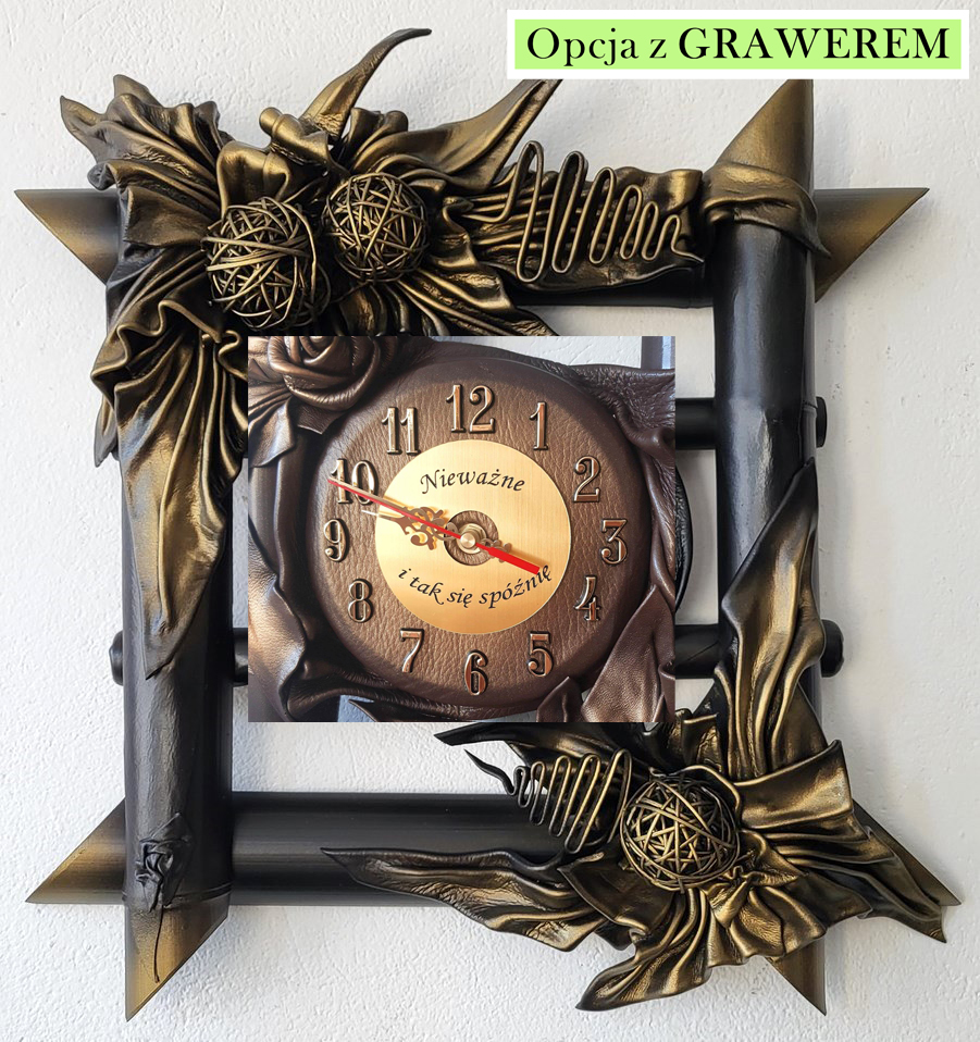 Zegar ścienny ze skóry i bambusa - czarno-mosiężny- na prezent jubileuszowy